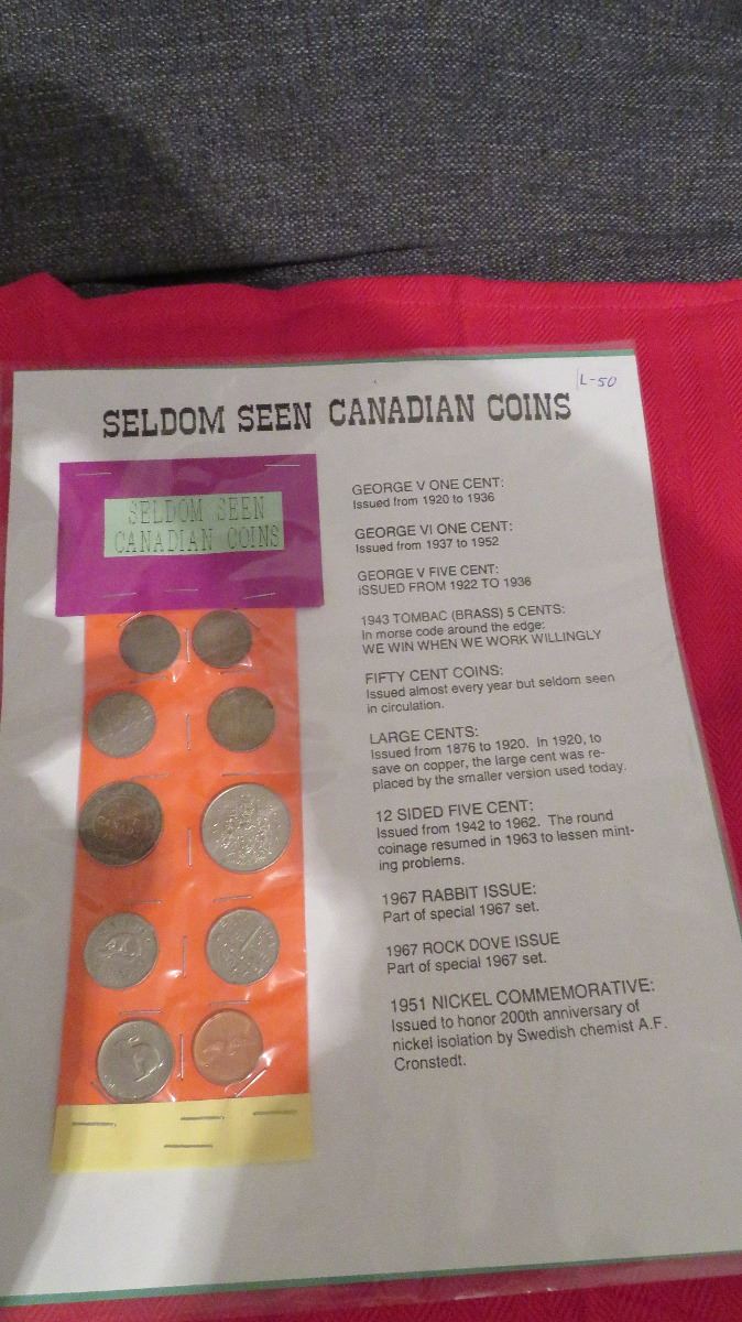 Ten seldom seen Canadian coins Large cent, 50 cents 1943 victory 5 cents George V etc. on descriptive display page markers neat gift for any age