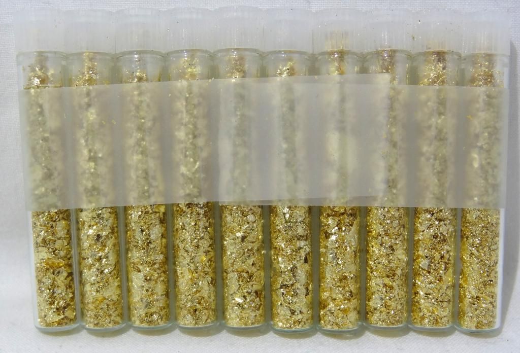 Ten small vials of gold Flakes