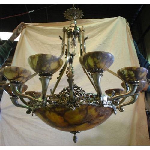 Ten tulips, twelve ligths, alabaster stone and casted bronze grand chandelier.It will be shipped in two crates, one with the alabaster component the other one with the bronze component. Some assembly will be required. The shipping cost within USA is $ 195.00. This iten is in working condition and was rewired to USA standards.