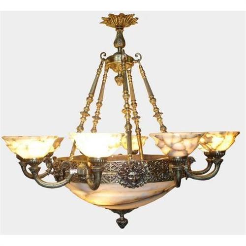 This alabaster stone chandelier has ten tulips plus two lights in the center dome. All the casted bronze fittings have an excellent craftsmanship.It will be shipped in two crates, one with the alabaster component the other one with the bronze component. Some assembly will be required. The shipping cost within USA is $ 195.00. This item was rewired to USA standars.Due to the nature of alabaster stone the pictures may not accurately represented the color and pattern of the alabaster.