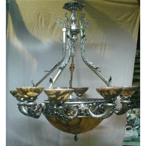 Five tulips, seven ligths, alabaster stone and casted bronze grand chandelier.It will be shipped in two crates, one with the alabaster component the other one with the bronze component. Some assembly will be required. The shipping cost within USA is $ 175.00. This iten is in working condition and was rewired to USA standards. It will take 4 to 5 weeks to deliver
