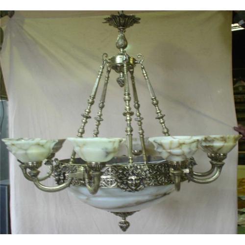 This alabaster stone chandelier has ten tulips plus two lights in the center dome. All the casted bronze fittings have an excellent craftsmanship.It will be shipped in two crates, one with the alabaster component the other one with the bronze component. Some assembly will be required. The shipping cost within USA is $ 175.00. This item was rewired to USA standars.Due to the nature of alabaster stone the pictures may not accurately represented the color and pattern of the alabaster.It will take 4 to 5 weeks to deliver