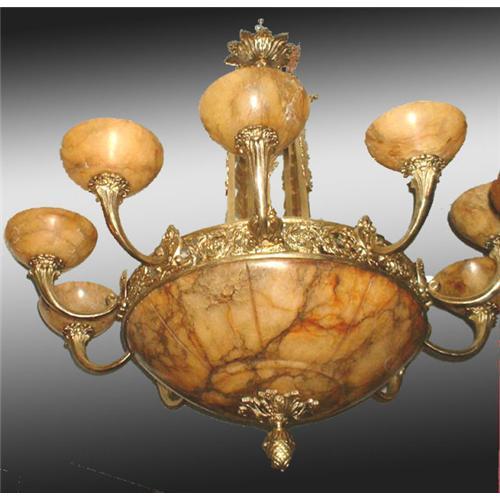 This alabaster stone chandelier has ten tulips plus two lights in the center dome. All the cast bronze fittings have an excellent craftsmanship. It will be shipped in two crates, one with the alabaster component the other one with the bronze component. Shipping cost is $ 175. Some assembly will be required. This item was rewired to USA standards. Due to the nature of alabaster stone the pictures may not accurately represented the color and pattern of the alabaster. We ship it any where. It takes 4 to 5 weeks to deliver.