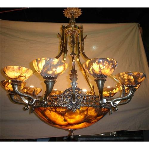 Handcrafted real alabaster stone and bronze was used for this item, glass and plastic supplanted alabaster in the construction of light fixtures.</em></td>