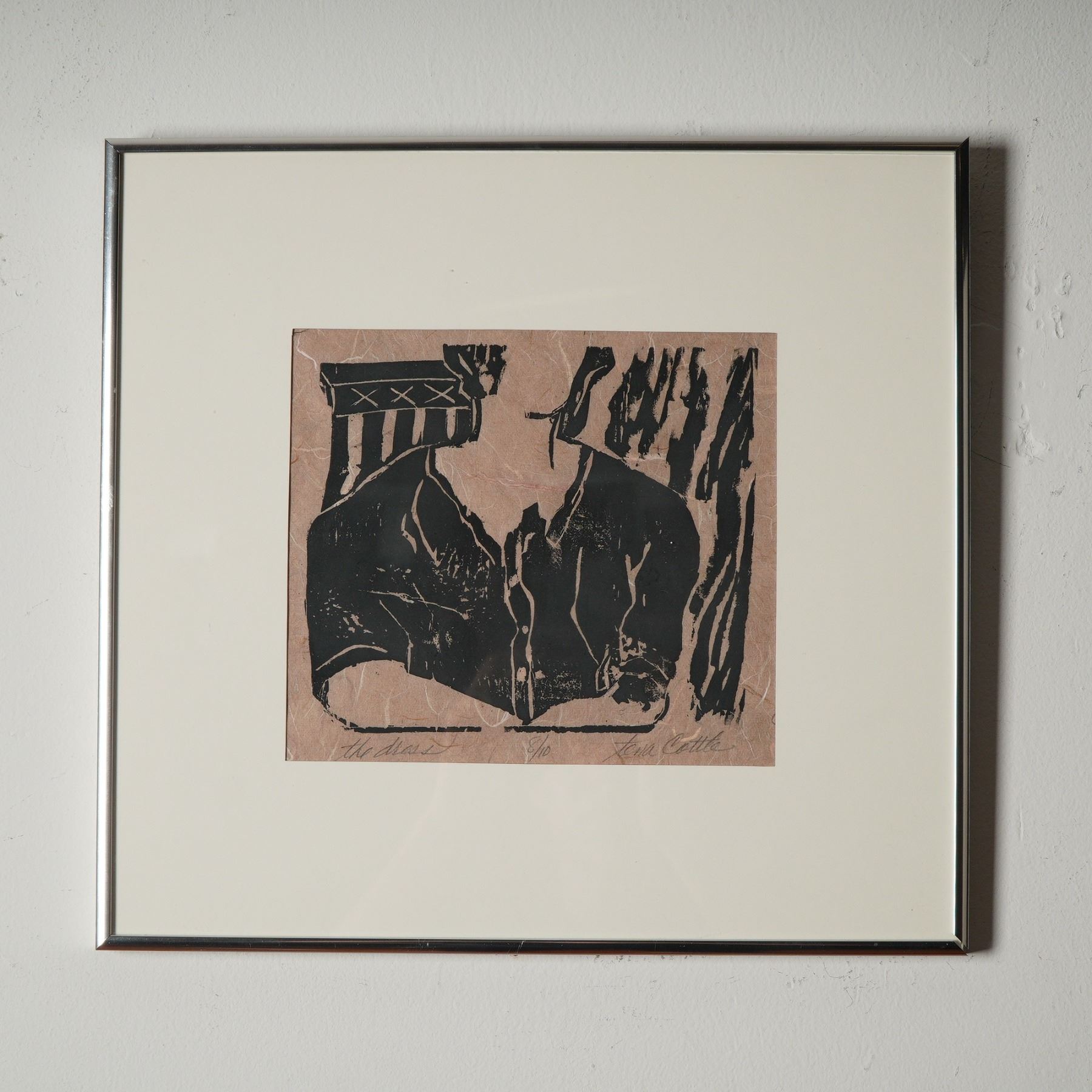 Limited edition woodblock print by artist Tena Cottle, titled The Dress. This work captures a bold, abstracted portrayal of a figure in a loose-fitting garment, rendered in black ink on textured, warm-toned paper. The composition balances minimalism with expressive linework, evoking both intimacy and mystery. Cottle, an artist based in Cincinnati, Ohio, is known for her distinctive style that merges modernist influences with personal narrative, often exploring themes of identity and form. Her work has been exhibited regionally and collected for its compelling graphic presence and emotional resonance. Presented under glass in a sleek metal frame with a cream mat, this print embodies the refined yet experimental spirit of contemporary American printmaking. Numbered 8/10 and hand-signed by the artist on lower right.