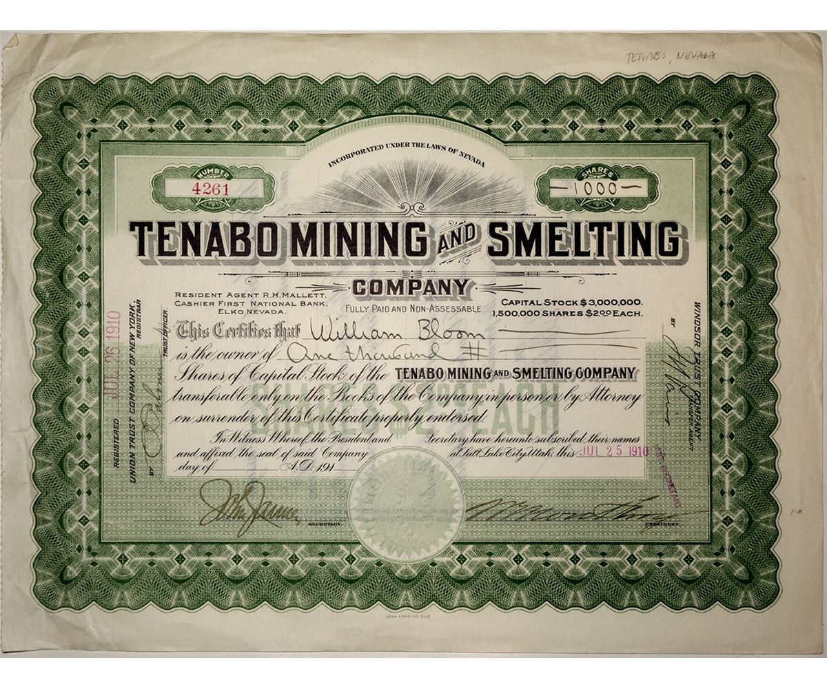 Uncancelled stock, no. 4261 issued to William Bloom, 1000 shares, president (illegible) and John James, Secretary, 1910. A rush immediately developed after silver and gold ore was discovered during the summer of 1906. A townsite was platted and by 1907 Tenabo had a population of 1,000. The residents supported a wide range of businesses including restaurants, hotels, assay office, grocery store, lumberyard, a school, and many saloons. A mill was built in nearby Mill Gulch. By 1909, most of the mines were controlled by the Tenabo Mining and Smelting Company. However, by 1911 the cost of producing the ore became higher than the value of the ore. The post office closed in 1912 and Tenabo quickly declined. The Tenabo mining and Smelting Company sold all of its holdings in 1920 after producing 12 million ounces of silver and 25,000 ounces of gold.
