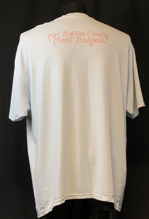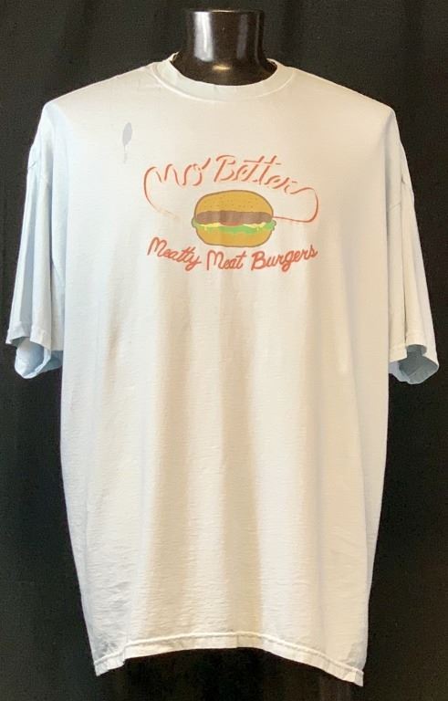 Shirt can be seen in the beginning of the film when KG brings JB (Jack Black) home and teaches him about the power slide and again in KG's I miss you beer vision. It is a light blue short sleeved T-shirt with a "Mo Better Meatty Meat Burger" transfer on the front and the back. The manufacturer tag has been removed.