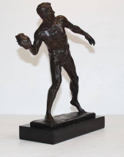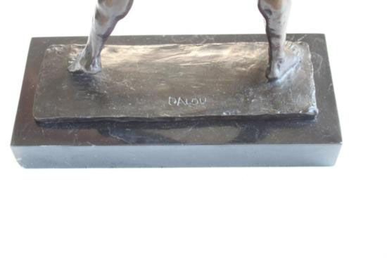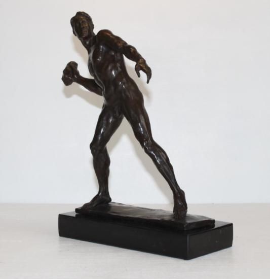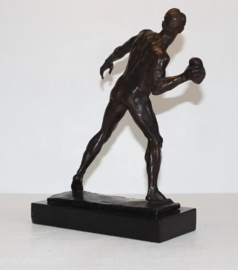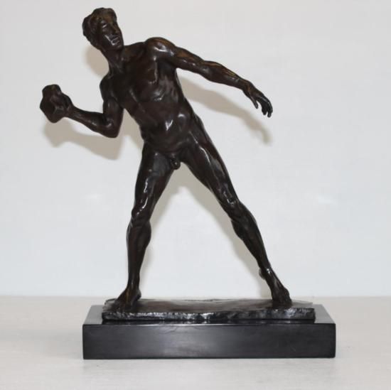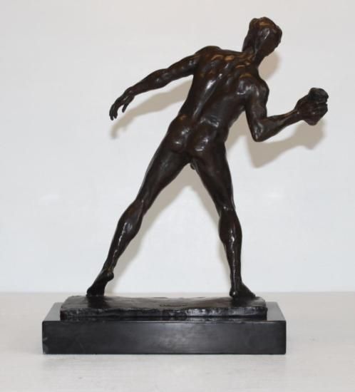 Tenacious Male Nude Athlete with Shotput, Bronze Sculpture, After Dalov 11 1/2"H x 9 1/2"W x 3 3/4"D 10lbs. This bronze sculpture was produced using the Lost Wax casting method. The Lost Wax Cast method is the most precise metal casting technique in existence, ensuring exquisite detail of the original host model which is usually sculpted in clay or wax. This Lost Wax casting method is an extremely labor intensive and expensive process, but the end results produce a Heirloom Quality Masterpiece!
