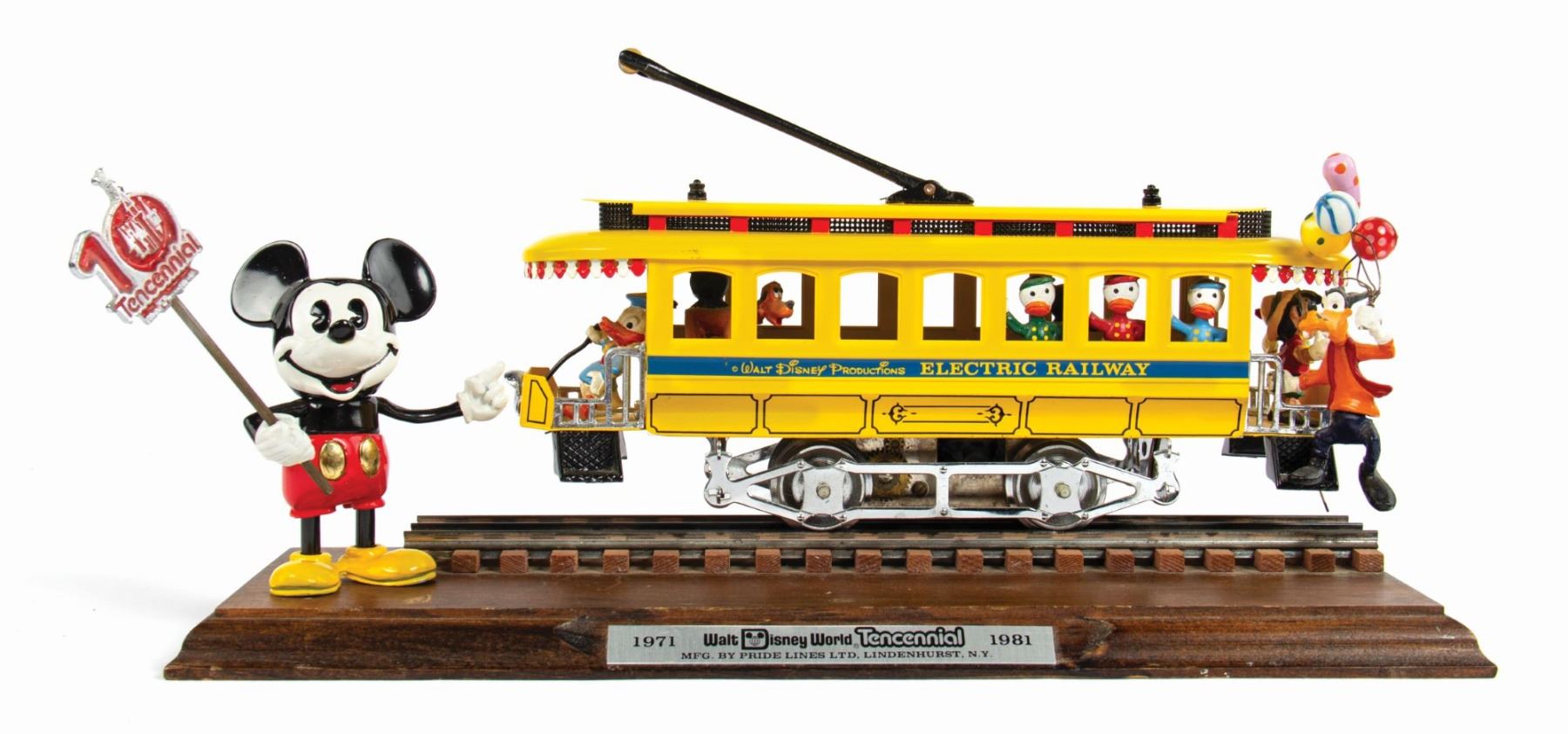 (Walt Disney World, 1981) A rare metal trolley car created in celebration of the tencennial anniversary of Walt Disney World. Created by Pride Lines Ltd., this wonderful 11" long trolley sits on a 0-027 gauge 3-rail track display base. Various Disney characters can be seen throughout and Mickey holds a special tencennial sign. The condition is good overall with some scuffs to the surfaces of the trolley, figures, and wooden base. Full functionality of the trolley mechanics has not been tested.