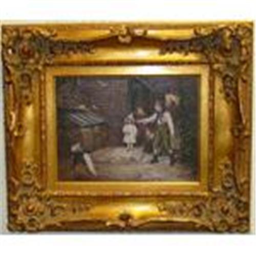 Children tending a dovecote. Signed by R. Mollat. In some cultures, particularly Medieval Europe, the possession of a dovecote was a symbol of status and power and was consequently regulated by law. Only nobles had this special privilege. The birds were kept both for their eggs and flesh. A beautifully detailed oil painting by a contemporary artist. Handsome handcrafted frame with wonderful details. Dimensions are of the painting. 12x16 Framed oil on board - $395. 24x30 Framed oil on canvas - $895. A beautifully detailed oil painting by a contemporary artist. Handsome handcrafted frame with wonderful details. Dimensions are of the painting.
