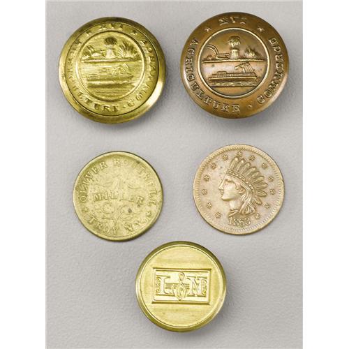 <B>Lot of Tennessee Buttons and Troy, New York Trade Tokens.</B></I> Includes: a State of Tennessee staff button, 23mm, WATERBURY BUTTON CO.* backmark, slightly bent shank; a post-Civil War State of Tennessee button, 23mm, M. C. LILLEY & CO. COLUMBUS, O. backmark; Louisville & Nashville Railroad button, 19mm, SCOVILL MFG. CO. WATERBURY backmark; copper trade token, 20mm, CHARLES BABCOCK, JEWELER TROY, N.Y., obverse dated 1863; and, brass trade token, 20mm, OLIVER BOUTHWELL MILLER * TROY N. Y. *, obverse dated 1863. All fine or better.<BR><BR><b>Shipping:</b> Miscellaneous Collectibles, Smal (<a target="_blank" href="http://www.heritageauctions.com/common/shipping.php">view shipping information</a>)