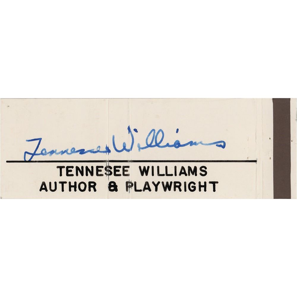 Blue ink signature, "Tennessee Williams,” on an unfolded 4.5 x 1.5 matchbook (sans matches). In fine condition.