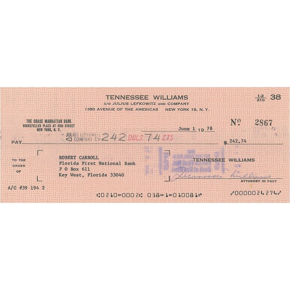 Crisp personal check, 8.5 x 3.5, filled out in type and signed by Tennessee Williams, payable to writer and partner Robert Carroll for $242.74, June 1, 1978. In fine condition. In the 1970s, when he was in his 60s, Williams had a lengthy relationship with Robert Carroll, a Vietnam veteran and aspiring writer in his 20s. Along with Williams' sister Rose, Carroll was one of the two people who received a bequest in Williams' will.