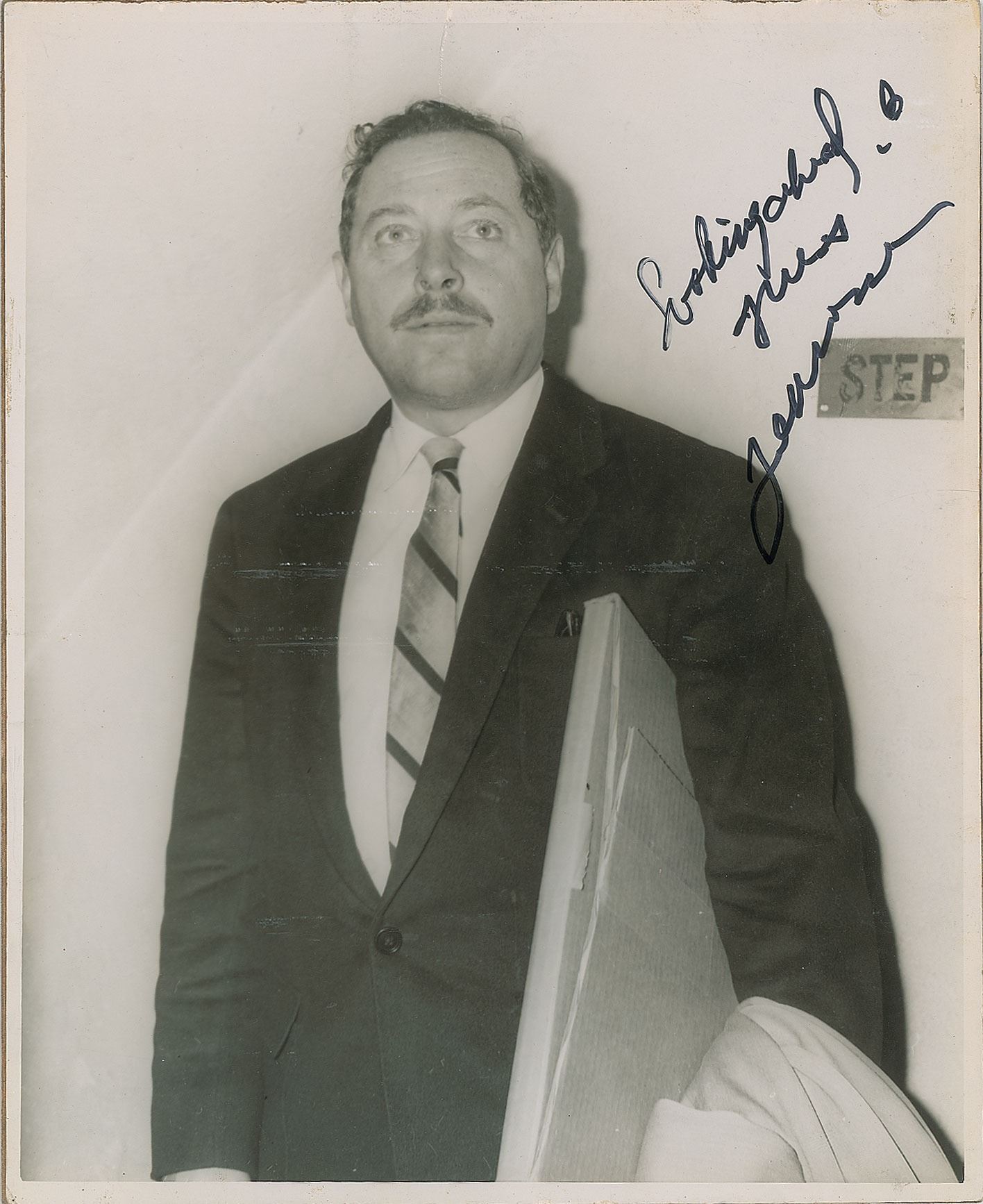 Uncommon vintage glossy 8 x 10 photo of Tennessee Williams in a half-length pose, signed in black felt tip, "Looking ahead, I guess, Tennessee." The photo is affixed to a same-size cardstock mount. In fine condition, with some light scuffs and surface impressions, and a short vertical crease at the top just touching Williams's hair.