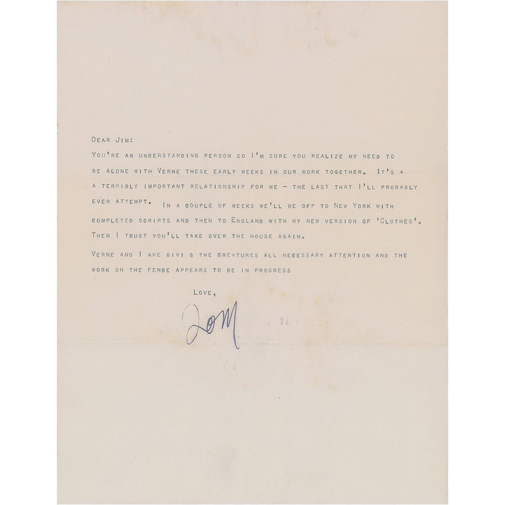 TLS signed “Tom,” one page, 8.5 x 11, no date but circa 1980. Letter to Jim Adams, in full: "You're an understanding person so I'm sure you realize my need to be alone with Verne these early weeks in our work together. It's a terribly important relationship for me—the last that I'll probably ever attempt. In a couple of weeks we'll be off to New York with completed scripts and then to England with my new version of 'Clothes.' Then I trust you'll take over the house again. Verne and I are giving the creatures all necessary attention and the work on the fence appears to be in progress." In very good to fine condition, with moderate intersecting folds and light overall wrinkling. Accompanied by the original envelope, which Williams has annotated in his own hand, "Jim Adams, Personal," and signed on the reverse, "Tennessee."
