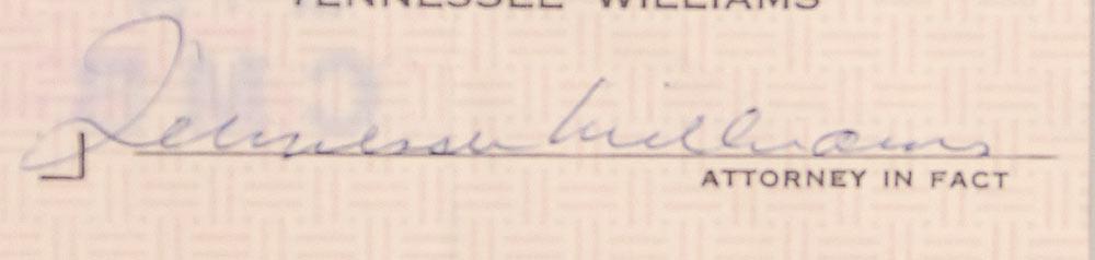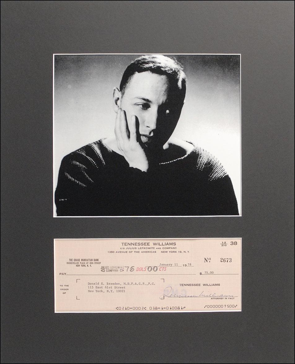 Personal check, 8.25 x 3.25, filled out in type and signed by Williams, payable to Donald E. Brandon, M.D.F.A.C.P., P.C. for $75.00, January 11, 1978. Matted with a portrait of Williams to an overall size of 13.5 x 16.5. Vertical fold through a single letter of signature, and light show-through from a stamp on reverse under first name of signature, otherwise fine condition.