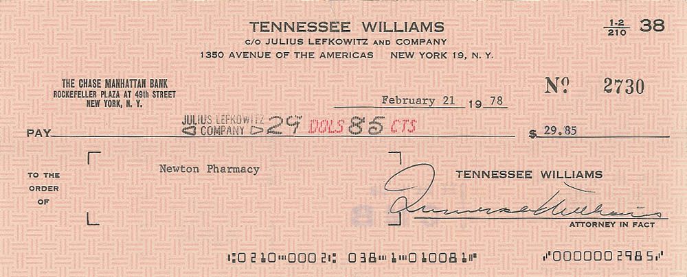 Business check, 8.5 x 3.5, filled out in type and signed by Williams, “Tennessee Williams,” payable to Newton Pharmacy for $29.85, February 21, 1978. A vertical fold passing through a single letter of the signature, light scattered creases, and a small tear to the upper border, otherwise fine condition.