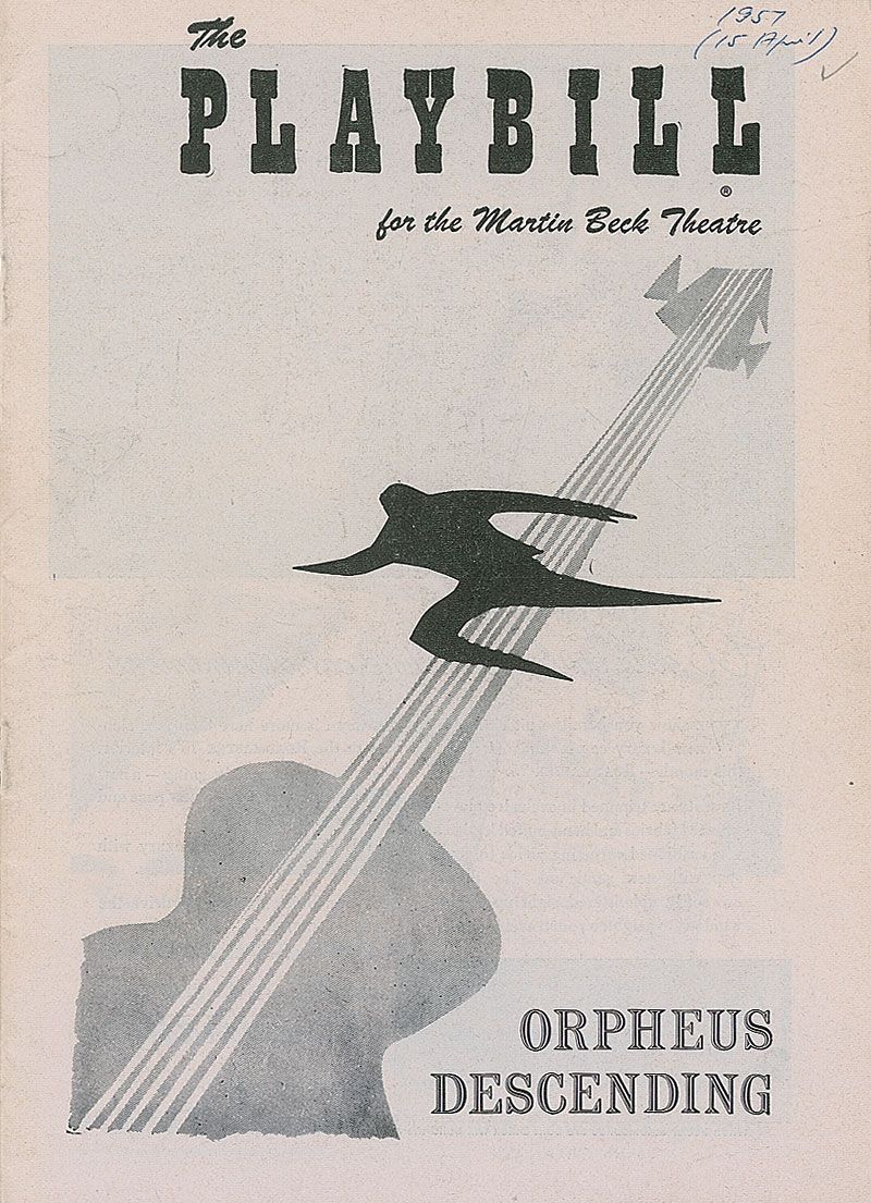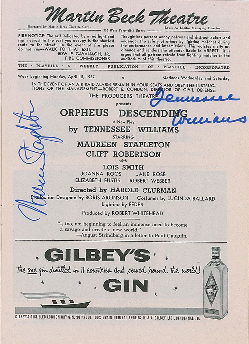 Playbill from the Martin Beck Theatre’s 1957 production of Orpheus Descending, 6.5 x 9, 28 pages, signed on the title page in blue felt tip by Williams and also signed by the play’s star Maureen Stapleton. In fine condition, with clipped corner to back cover and an ink notation on the front cover.