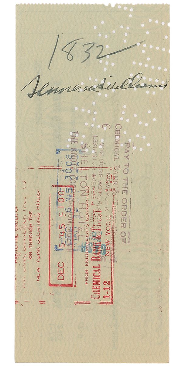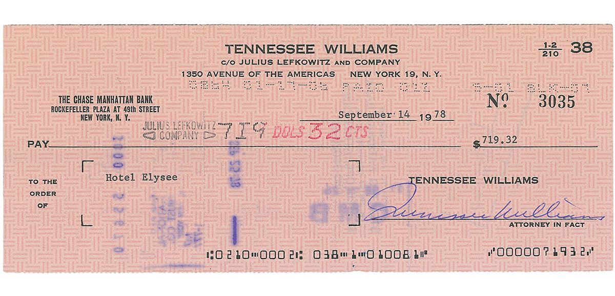 Personal check, 8.5 x 3.25, filled out in type and signed by Williams, payable to Hotel Elysee for $719.32, September 14, 1978. Bank stamp touching first letter and two vertical folds, one through a single letter of signature, otherwise fine condition.