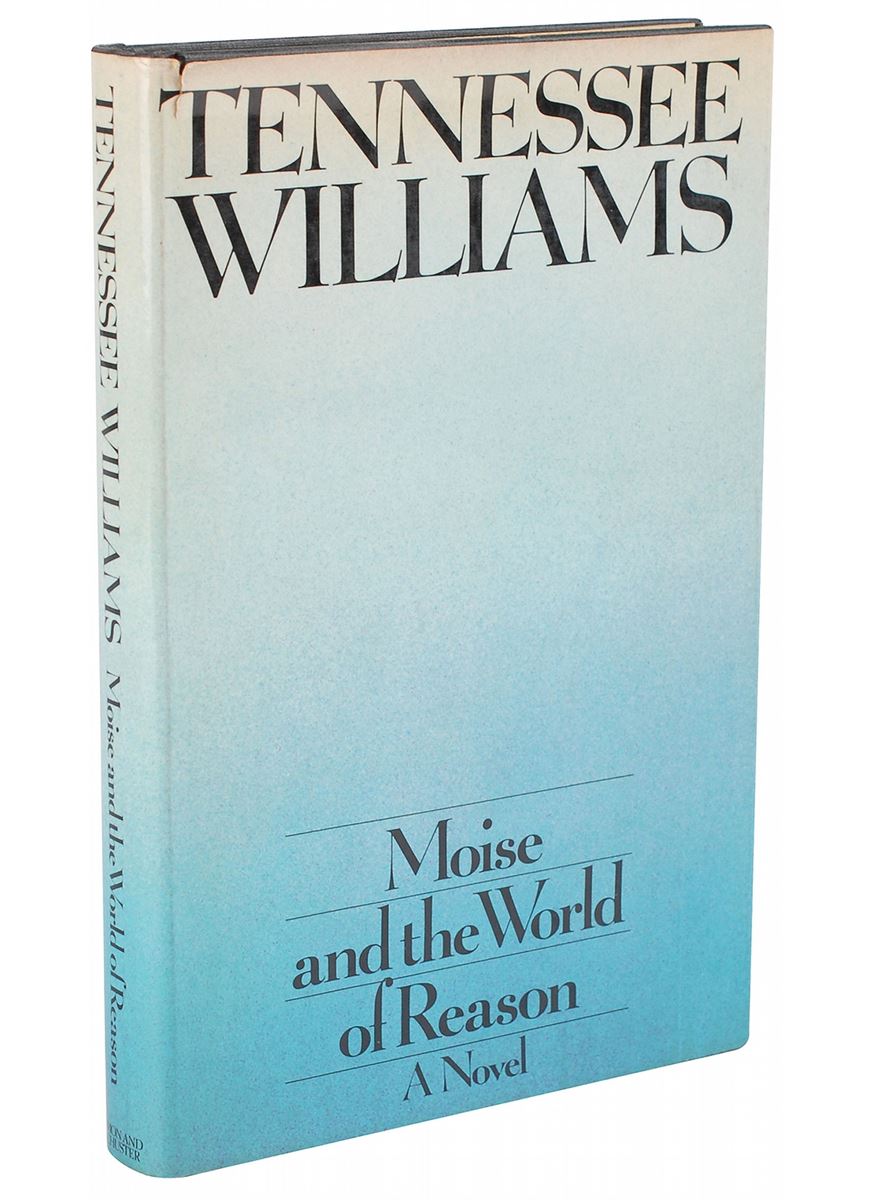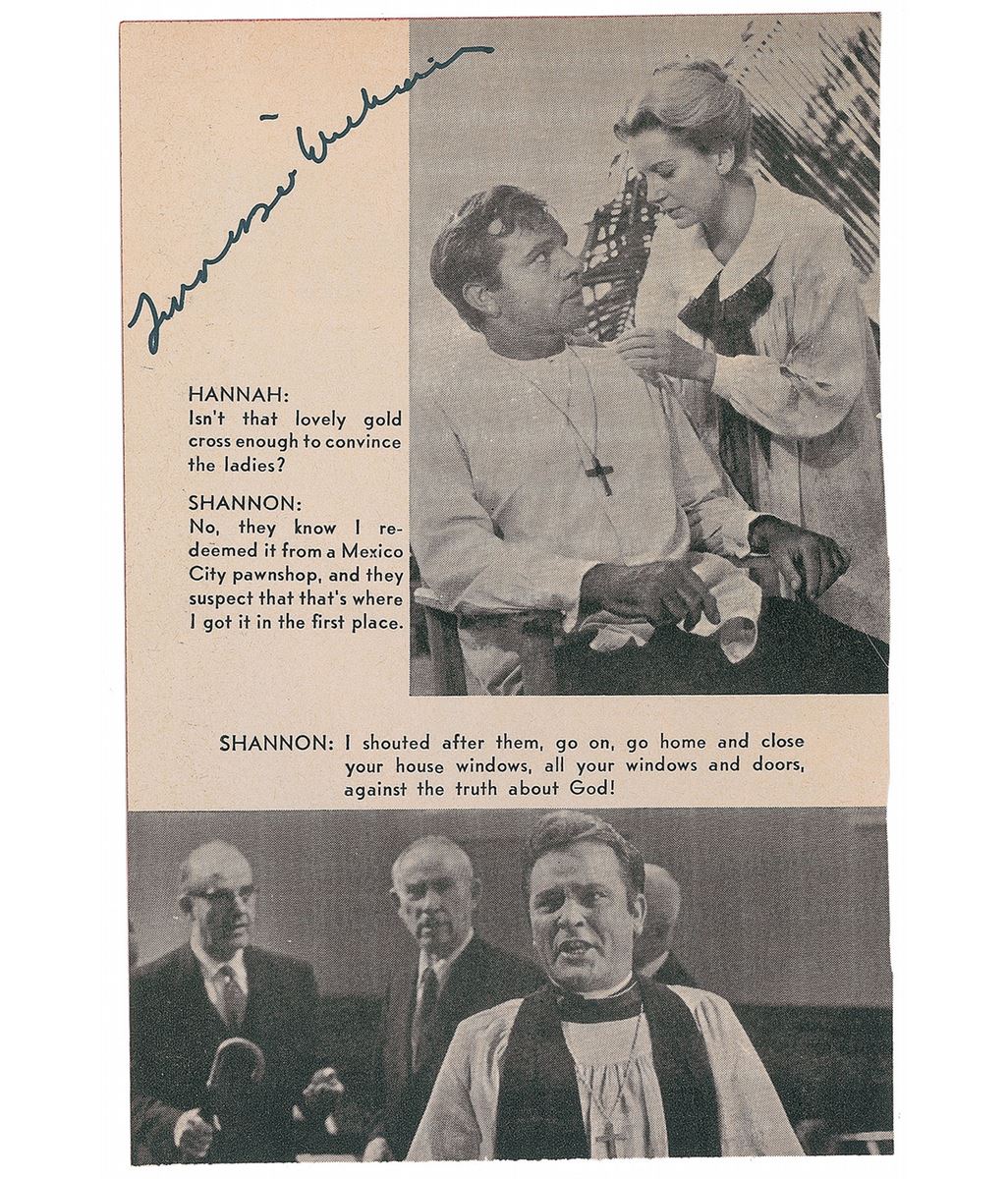 Desirable 4 x 6 book page photo featuring dialog and scenes from the 1964 film The Night of the Iguana, signed in the upper left in black ink. In fine condition, with trimmed right and bottom edges. Accompanied by an unsigned first edition, first printing of Moise and the World of Reason, with original dust jacket.