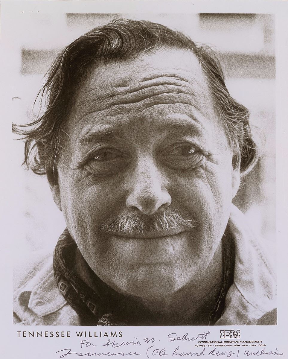 Glossy 8 x 10 ICM publicity close-up photo of Williams, signed and inscribed in the lower border in black ballpoint, “For Irwin M. Schuett, Tennessee (ole hound dawg) Williams.” In fine condition, with slight rippling, and an irregular surface impression and staple holes to upper left corner.