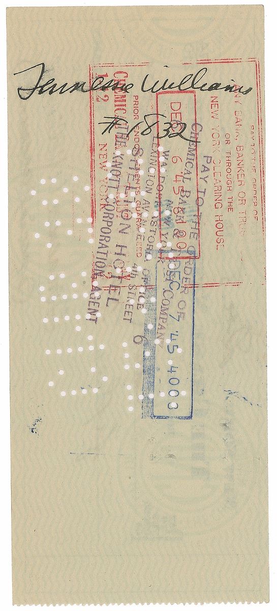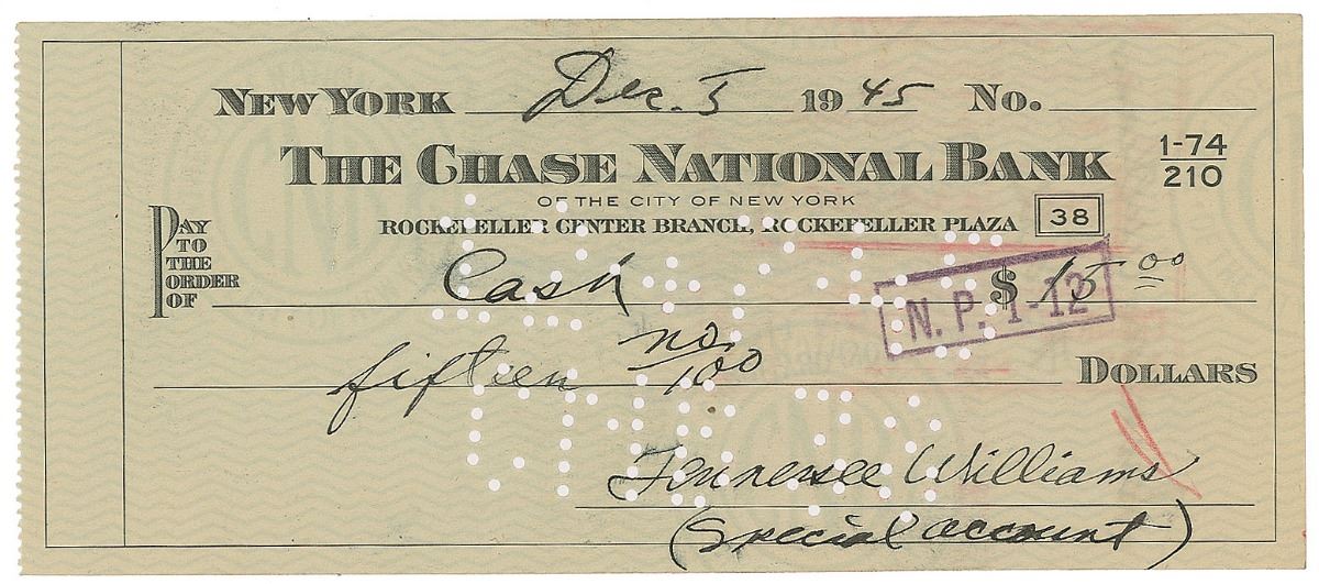Twice-signed Chase National Bank check, 6.25 x 2.75, filled out and signed by Williams, “Tennessee Williams, (Special account),” payable to cash for $15, December 5, 1945, and endorsed on the reverse by Williams. In fine condition, with expected cancellation holes affecting most of his first name. Accompanied by a pair of modern glossy photos.