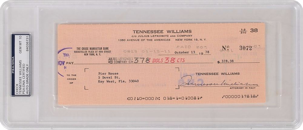 Personal check, 8.5 x 3.5, filled out in type and signed by Williams, payable to Pier House for $378.38, stamp-dated October 13, 1978. Encapsulated in a plastic PSA/DNA authentication and grading holder, evaluating the autograph as "GEM MT 10." In fine condition.