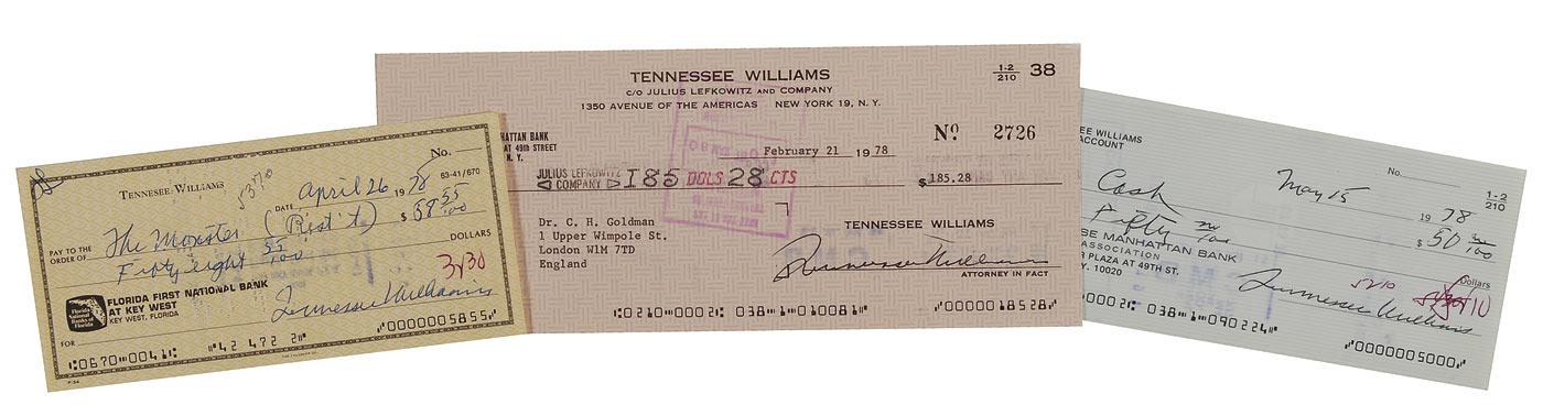 Signed book: I Rise in Flame, Cried the Phoenix. Limited edition of 310 copies (this being No. 48). Connecticut: James Laughlin, 1951. Hardcover with dustjacket, 8.25 x 11.5, 42 pages. Signed on the limitations page in blue ballpoint by Williams. In fine condition, with some light wear to covers, small tear to spine, and prior owner’s name blind stamped on the first three pages (including the signed page). Slipcase is irregularly toned, with small edge separations and a repair to one edge. Pre-certified PSA/DNA and RRAuction COA.