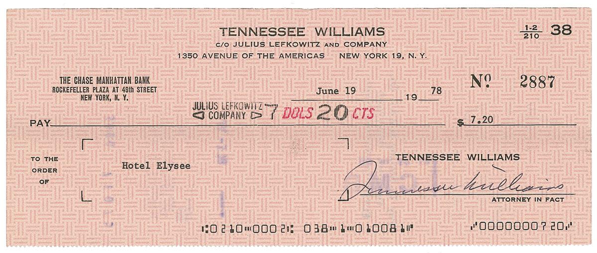 Personal check, 8.5 x 3.5, filled out in type and signed by Williams, payable to Julius Lefkowitz Company for $7.20, June 19, 1978. In fine condition, with a vertical fold to left side, and light show-through from stamps on reverse, one showing-through under first name of signature.