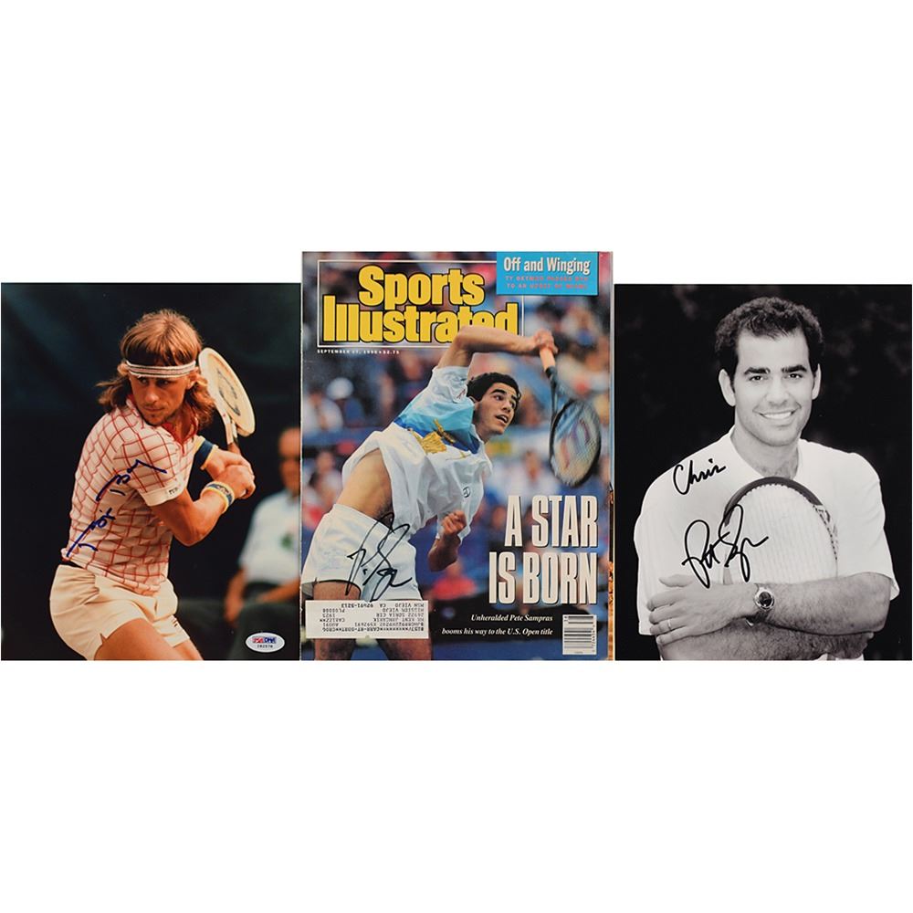 Three items signed by all-time tennis greats: a color glossy 8 x 10 photo of Bjorn Borg in action, signed in blue felt tip; a glossy 8 x 10 portrait of Pete Sampras, signed and inscribed in black felt tip, "Chris, Pete Sampras"; and a Sports Illustrated magazine cover from 1990 featuring Sampras with the headline "A Star Is Born," signed in black felt tip by Sampras. In overall fine condition, with a PSA/DNA label affixed to the corner of the Borg photo. Accompanied by a certificate of authenticity from PSA/DNA for Borg.