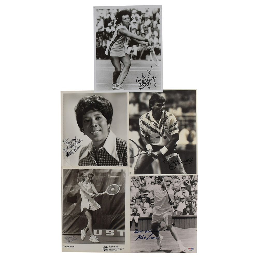 Five glossy photos individually signed by a notable tennis player, each approximately 8 x 10, including: Tracy Austin, Jimmy Connors, Althea Gibson (ins), Billie Jean King, and Rod Laver. In overall fine condition, with an excised lower right corner to the Gibson photo.