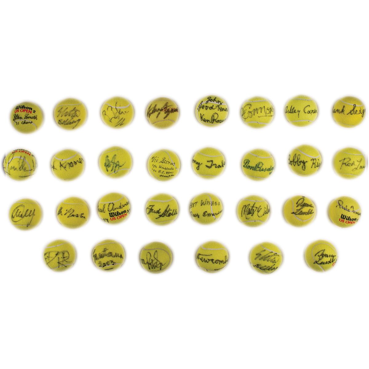 Thirty official Wilson tennis balls signed (one inscribed) in black felt tip by individual US Open Champions. Signers are: Don Budge, Bobby Riggs, Jack Kramer, Arthur Larsen, Frank Sedgman, Tony Trabert, Vic Seixas, Ken Rosewall, Malcolm Anderson, Ashley Cooper, Neale Fraser, Roy Emerson, Rod Laver, Manual Santana, Fred Stolle, John Newcombe, Stan Smith, Ilie Natase, Jimmy Connors, Guillermo Vilas, Ivan Lendl (2), Mats Wilander, Boris Becker, Pete Sampras (2), Stefan Edberg, Andre Agassi, Patrick Rafter, and Marat Safin. In fine condition, with some of the lettering blurry from the texture of the balls.