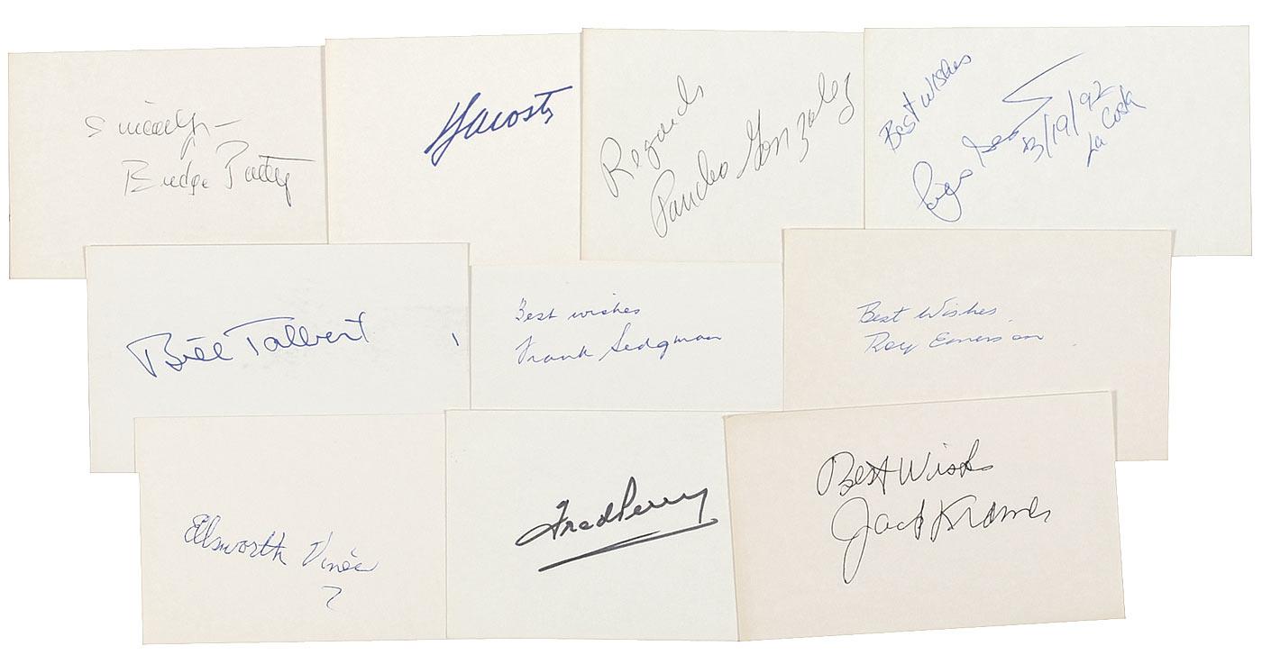 Ink and felt tip signatures of ten tennis greats on individual off-white 5 x 3 cards. Signers are: Rene Lacoste, Pancho Gonzalez, Pancho Segura, Roy Emerson, Frank Sedgman, Bill Talbert, Jack Kramer, Ellsworth Vines, Fred Perry, and Budge Patty. In fine condition.