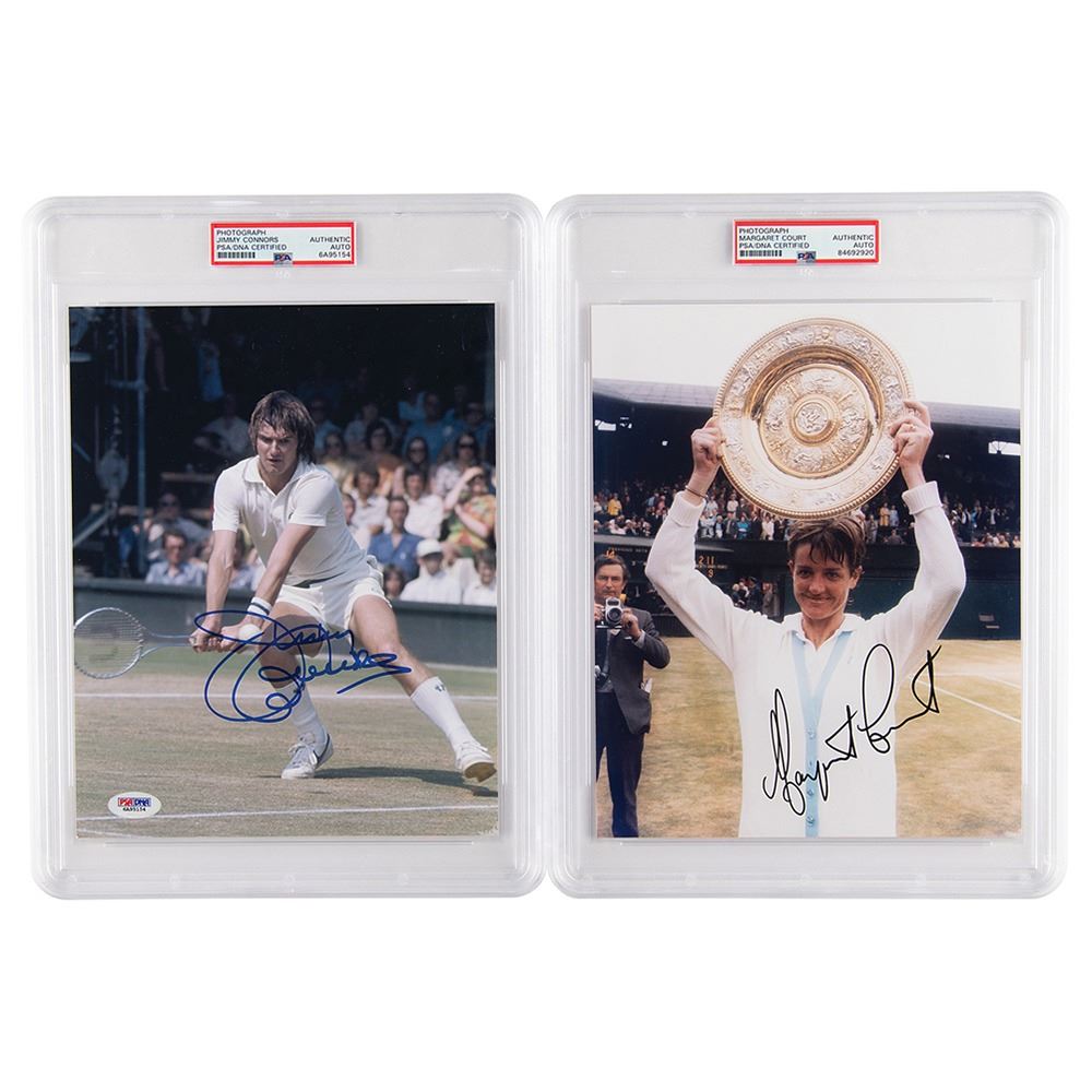 Two color glossy 8 x 10 photos of tennis legends Jimmy Connors and Margaret Court, signed in blue or black felt tip by the pictured athlete. In overall fine condition, with a PSA/DNA label affixed to the lower left corner. Both are encapsulated in PSA/DNA authentication holders. Accompanied by a certificate of authenticity from PSA/DNA for the Connors photo.