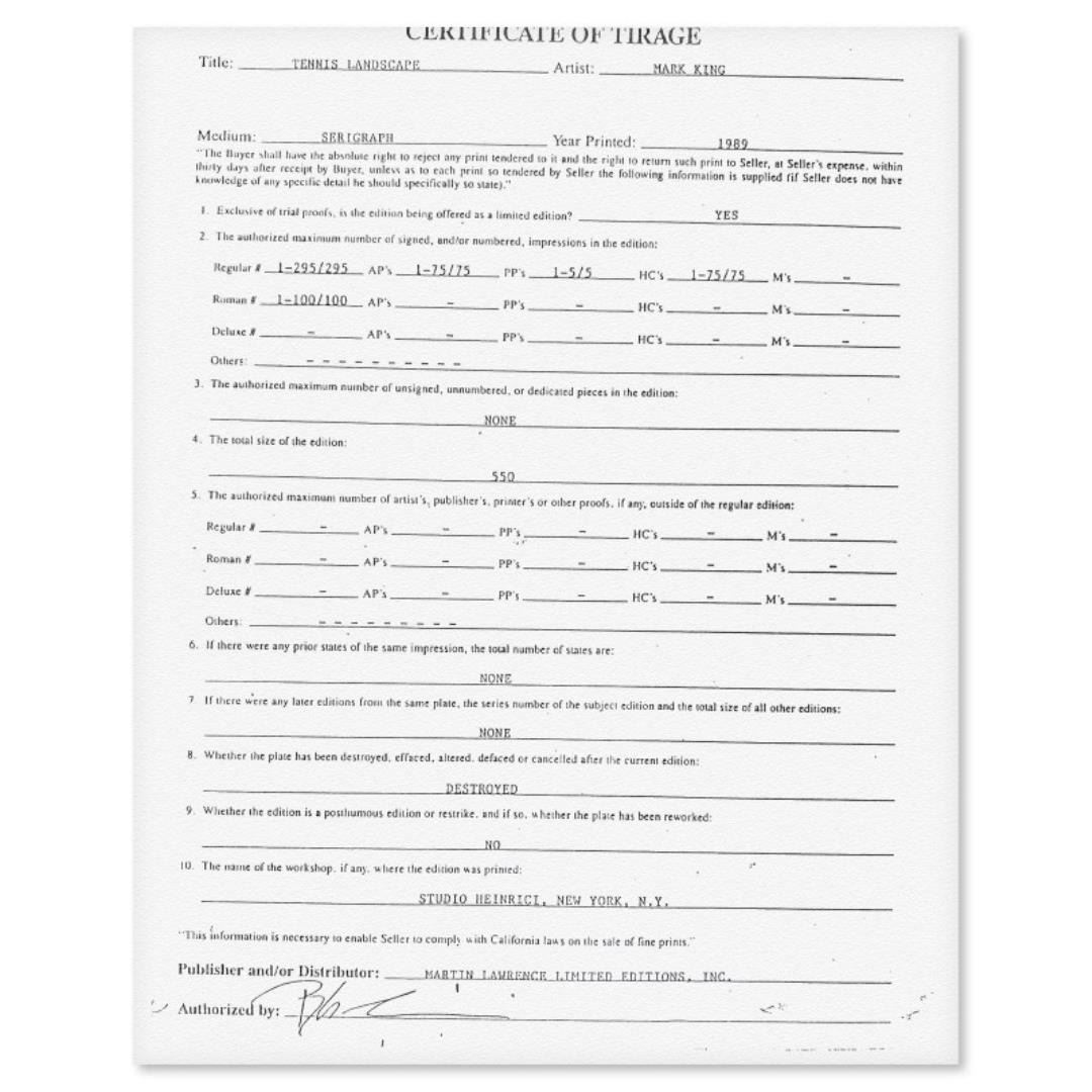 "Tennis Landscape" is a limited edition serigraph on paper by Mark King (1931-2014). Hand signed and numbered, this piece comes with a letter of authenticity and measures approximately 30" x 40.5" (image).