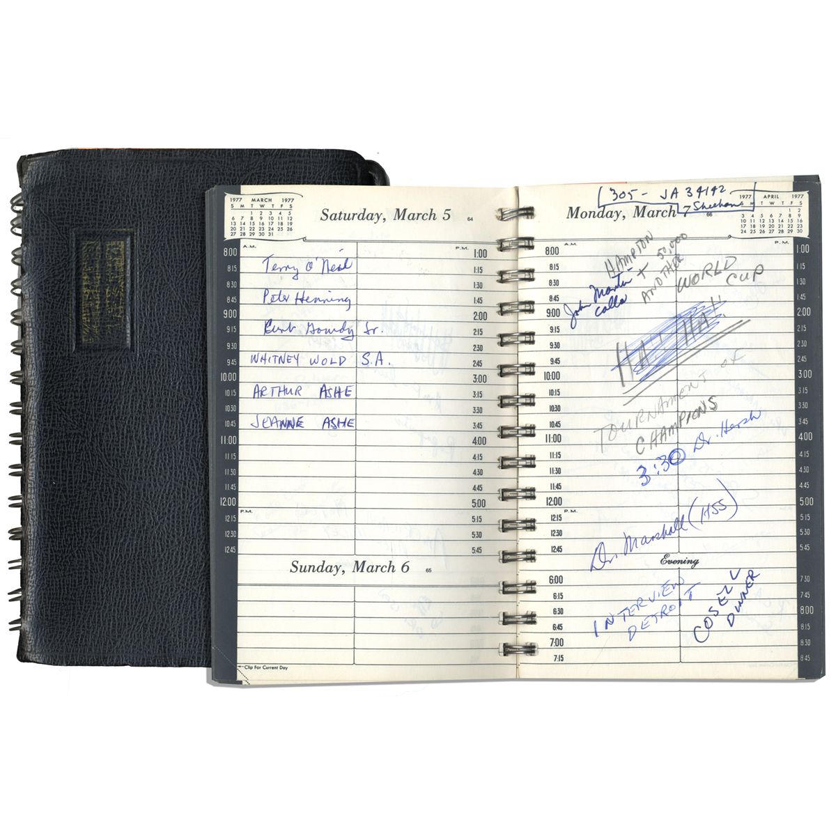Arthur Ashe's 1977 day planner. Journal was consistently used by Ashe all year to remember appointments and record the important events in his busy life, particularly as he had won Wimbledon two years prior, as the first African American in history. Notations in Ashe's hand appear on most every page of the spiral-bound ''Eaton's'' Day-At-A-Glance book, save for some spotty weeks where he was on a rest. He notes various tennis matches throughout the year, including the ''Tournament of Champions'' and ''Wimbledon''. He also attended various tennis and sports-related functions, including the ''Davis Cup Dinner'' and the ''ATP Board Meeting''. His year included various trips around the world, including one to ''Jo'Burg''. Media appearances include ABC, NY Times and many more. Features a black faux-leather soft cover that is tearing slightly at binding. Measures 5.75'' x 8.25''. In very good condition, with mild toning throughout. With an LOA from Arthur Ashe's widow. A very personal record of each significant day at the height of Ashe's career.