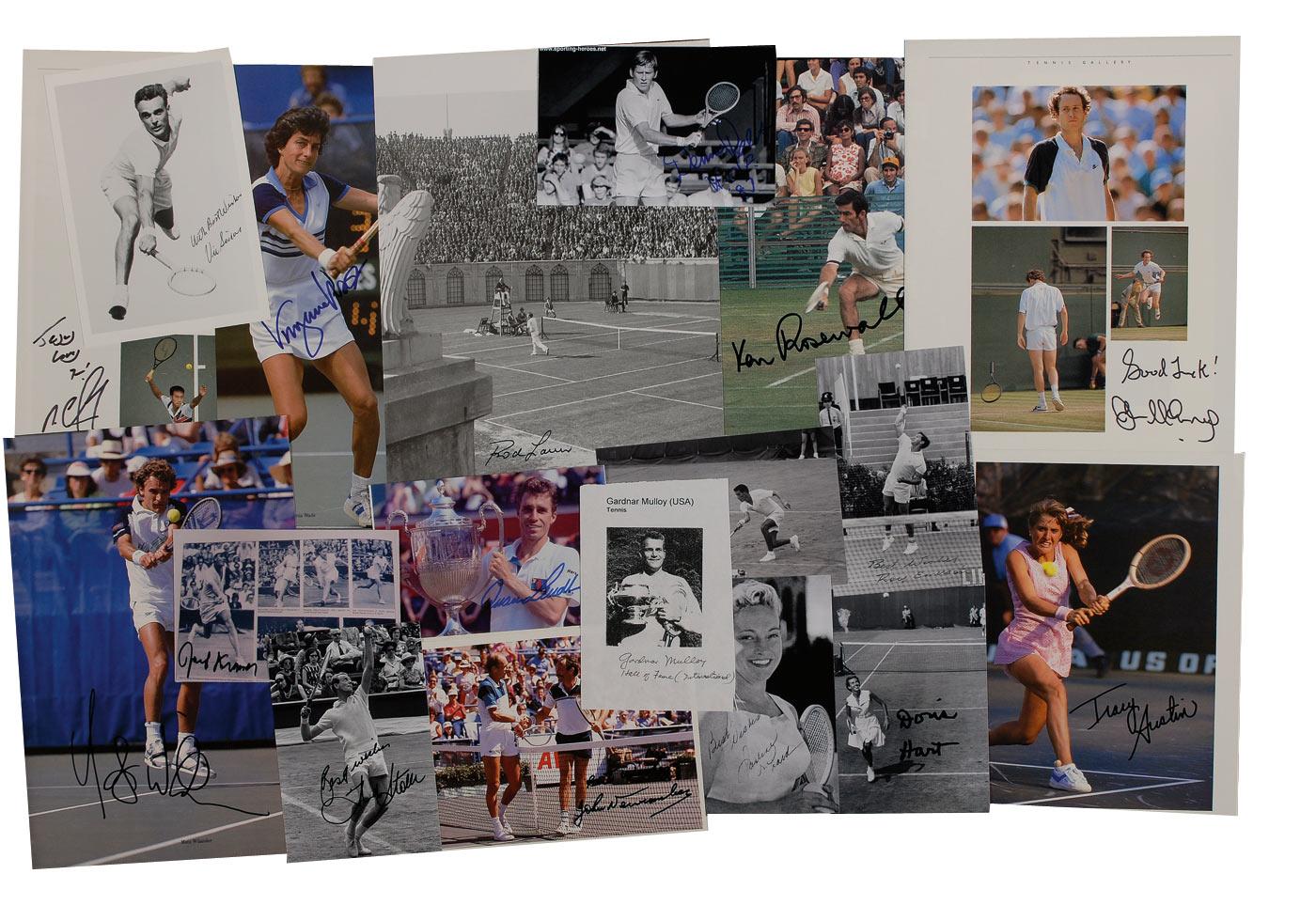 Eighteen signed photos, various finishes, including book and paperstock photos, ranging in size from 4 x 6 up to 8.5 x 12.25, each signed in ink or felt tip by the respective player pictured. Signers are: Rod Laver, John McEnroe, Dennis Ralston, Darlene Hard, Ivan Lendl, Jack Kramer, Michael Chang, Gardnar Mulloy, Fred Stolle, John Newcombe, Roy Emerson, Doris Hart, Vic Seixas, Virginia Wade, Mats Wilander, Tracy Austin, Alex Olmedo, and Ken Rosewall. In fine overall condition.