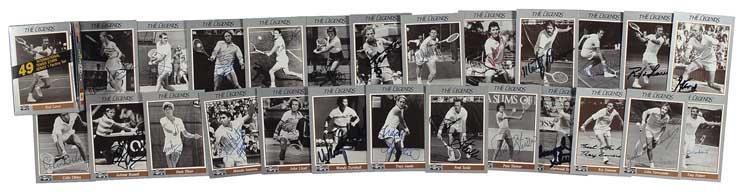 Set of 49 Netpro legends cards, issued in 1991, with 25 signed on the front in ink or felt tip by the respective legend pictured. Signers are: Stan Smith, Rod Laver, Tony Trabert, John Newcombe, Roy Emerson, Sherwood Stewart, Pam Shriver, Fred Stolle, Tracy Austin, Wendy Turnbull, John Lloyd, Manolo Santana, Hank Pfister, JoAnne Russell, Tom Okker, Marty Riessen, Kim Warwick, Cliff Richey, Dick Stockton, Ilana Kloss, Bernard Bartzen, Colin Dibley, Bob Lutz, Owen Davidson, and Ros Fairbank. In fine condition. RRAuction COA.