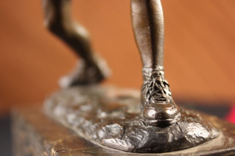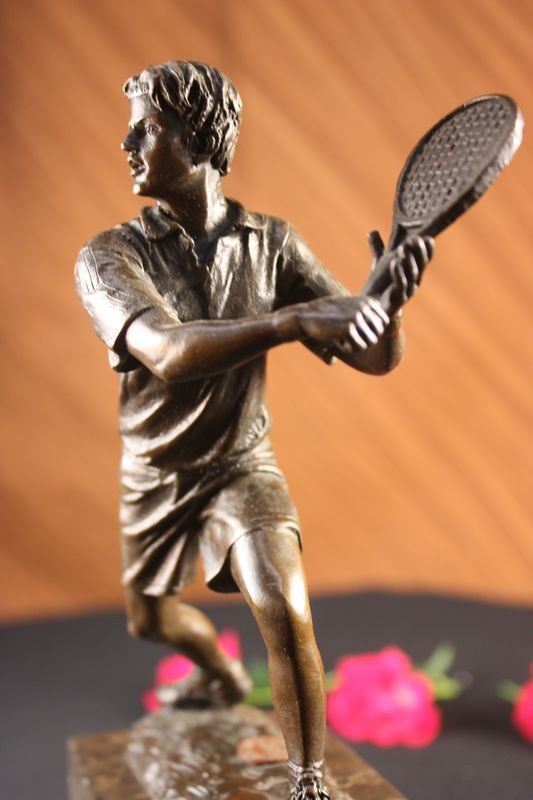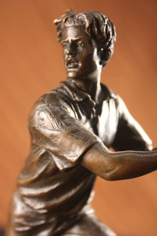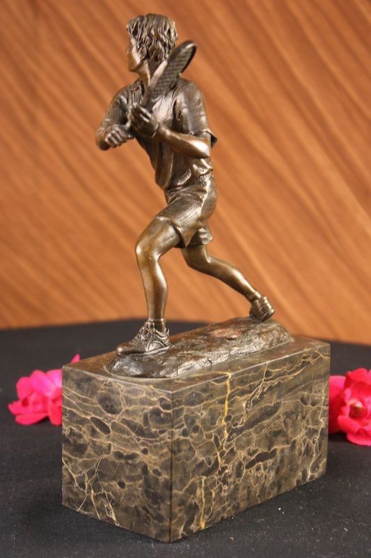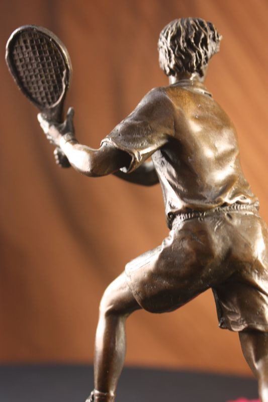 He eyes the swing of his opponent and waits for the green ball to soar back over the net. He lunges to the side and prepares to swing his racket. This pro tennis player is dressed in a loose cotton short-sleeved shirt, matching shorts, and sneakers. This would make a great gift for the Wimbledon lover in your life. This brown patina sculpture was cast using the Lost Wax Method and mounted on a marble base. Dimensions: Height 10 X Width 5 inches. Weight: 7 LBS.
