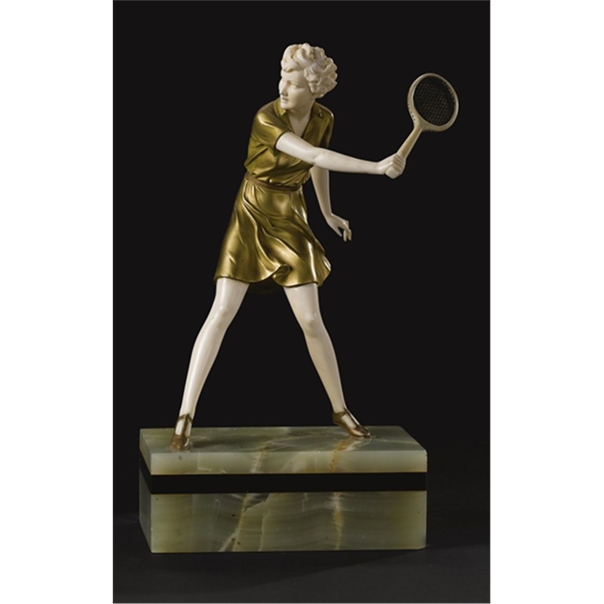 Bronze and ivory sculpture, Tennis Player-Female. Base signed, All ivory under lawful government permit, beautifully patina bronze, sits on a marble/onyx base. Some variations of marble and patina might occur. By Ferndinand Preiss, 11.5"H