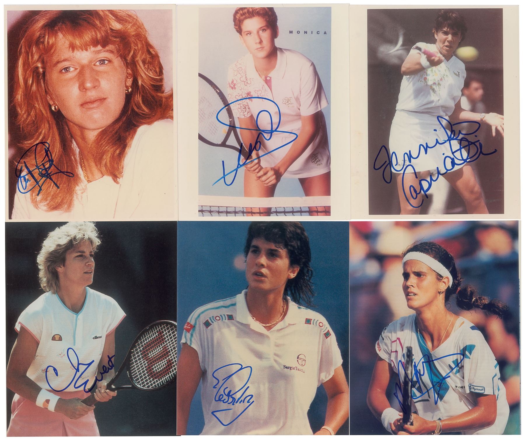 Six color glossy 8 x 10 photos of female tennis stars, individually signed in blue felt tip, including: Steffi Graf, Monica Seles, Jennifer Capriati, Chris Evert, Mary Jo Fernandez, and Gabriella Sabatini. In overall fine condition. Originally obtained by in-person specialist Mike Wehrmann.
