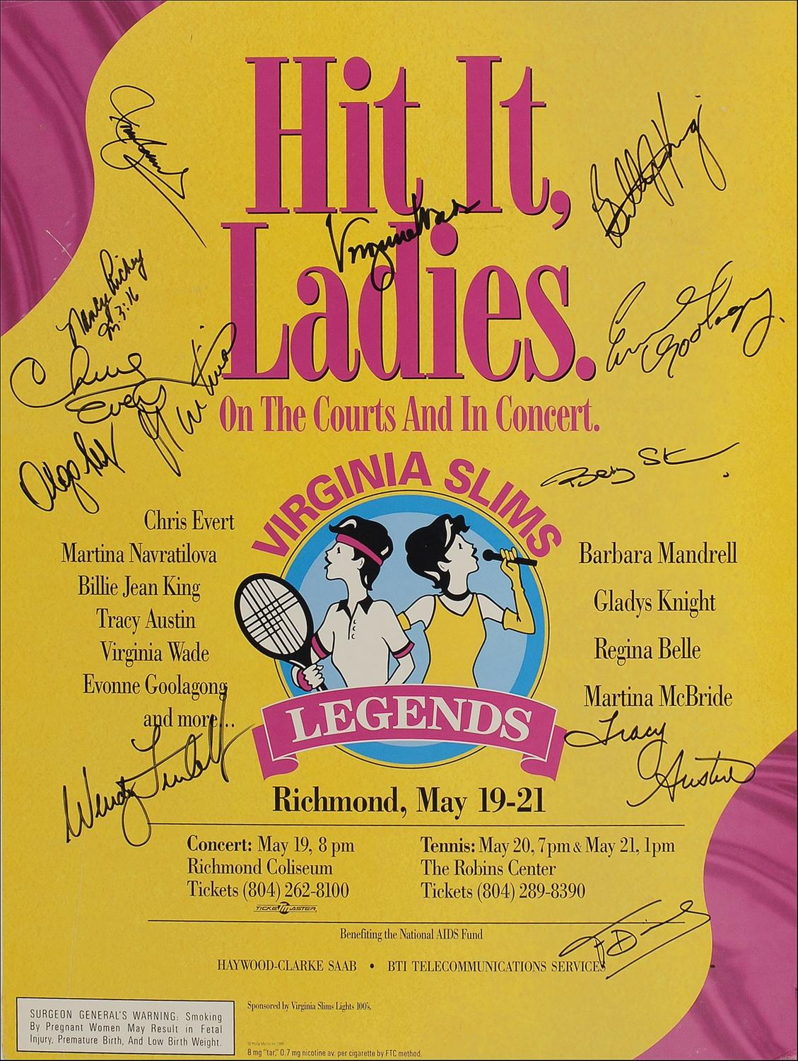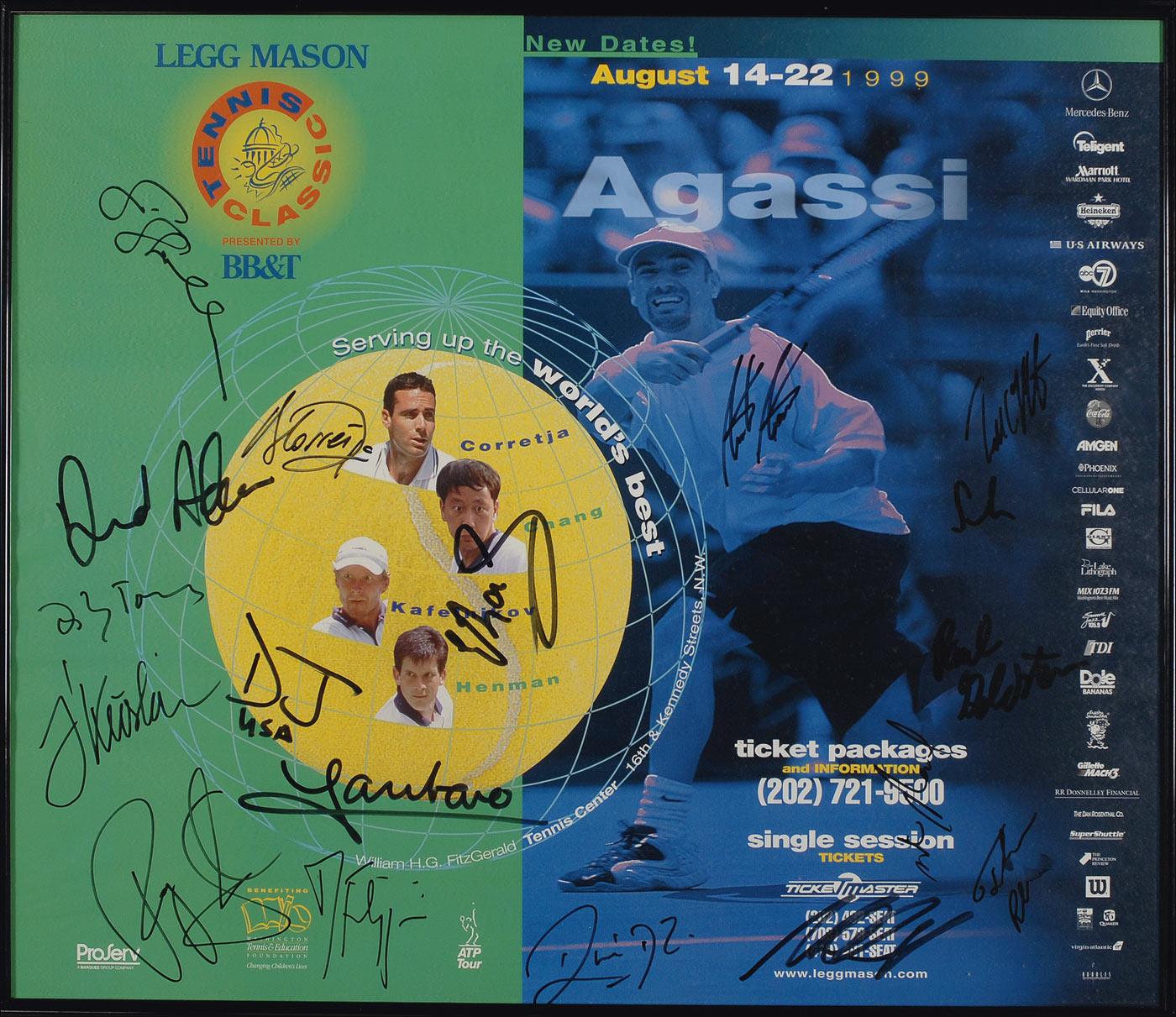 Two color posters: an 18 x 24 poster (affixed to an identical size piece of foam core) for the Virginia Slims Legends tournament and concert, signed in black felt tip by 12 participants including Chris Evert, Billie Jean King, Tracy Austin, Evonne Goolagong, Virginia Wade, and Martina Navratilova; and a 24 x 20 poster for the 1999 Legg Mason Tennis Classic, signed in black felt tip by 16 participants including Andre Agassi and Michael Chang. Framed to an overall size of 24.25 x 20.25. In fine overall condition. Oversized.