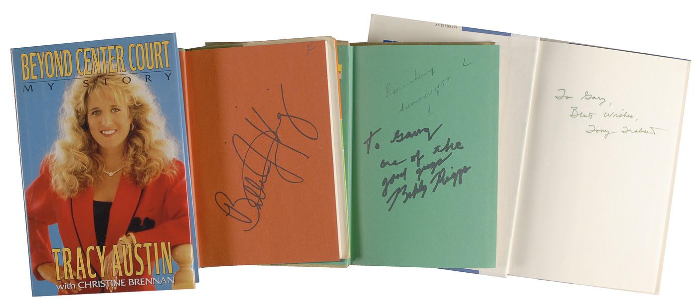 Four hardcover books, each signed on an opening page by their respective author. Signers are: Billy Jean King (Tennis to Win), Bobby Riggs (Court Hustler, no dustjacket, ins), Tracy Austin (Beyond Center Court, ins), and Tony Trabert (Trabert on Tennis, ins). In overall very good to fine condition.