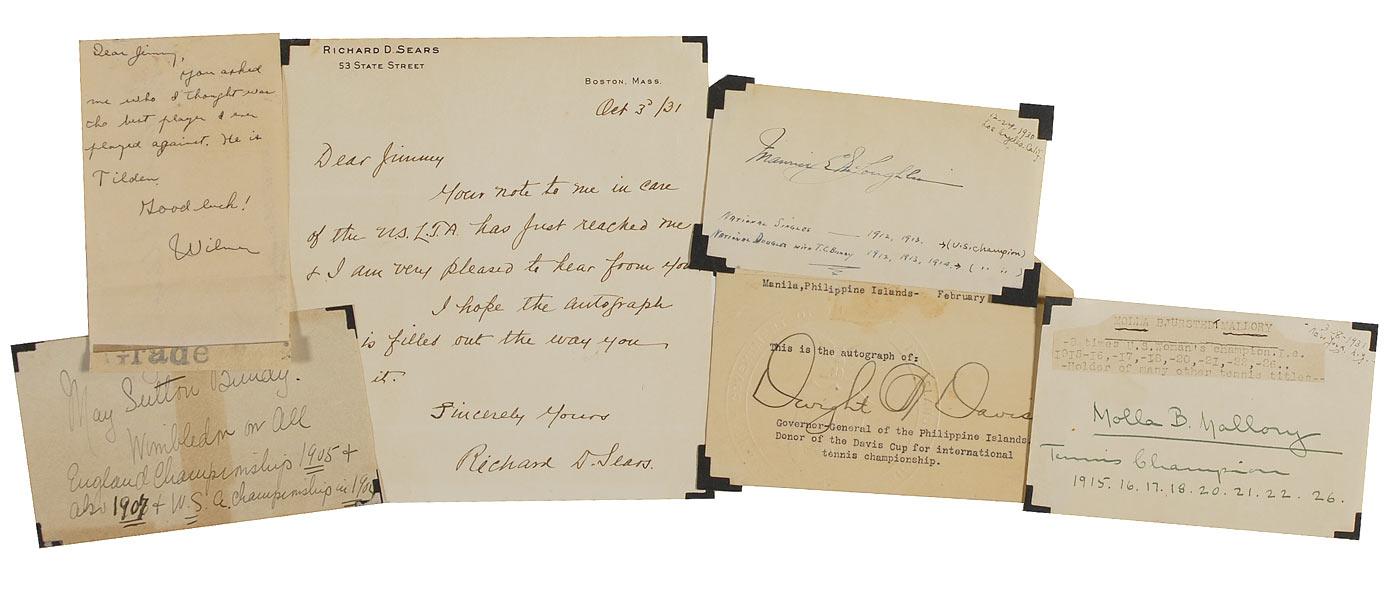 Six items consisting of four vintage signatures on off-white slips, and two brief ALSs, each signed by a respective tennis great. Signatures are from Dwight Davis, Molla B. Mallory, May Sutton Bundy, and Maurice McLoughin; letters are from Richard D. Sears and Wilma Allison, who writes, in full: “You asked me who I thought was the best player I ever played against. He is Tilden.” In very good condition, with uniform toning, with a few heavier areas, expected folds to letters, and corner tab mounting remnants to most of the items.