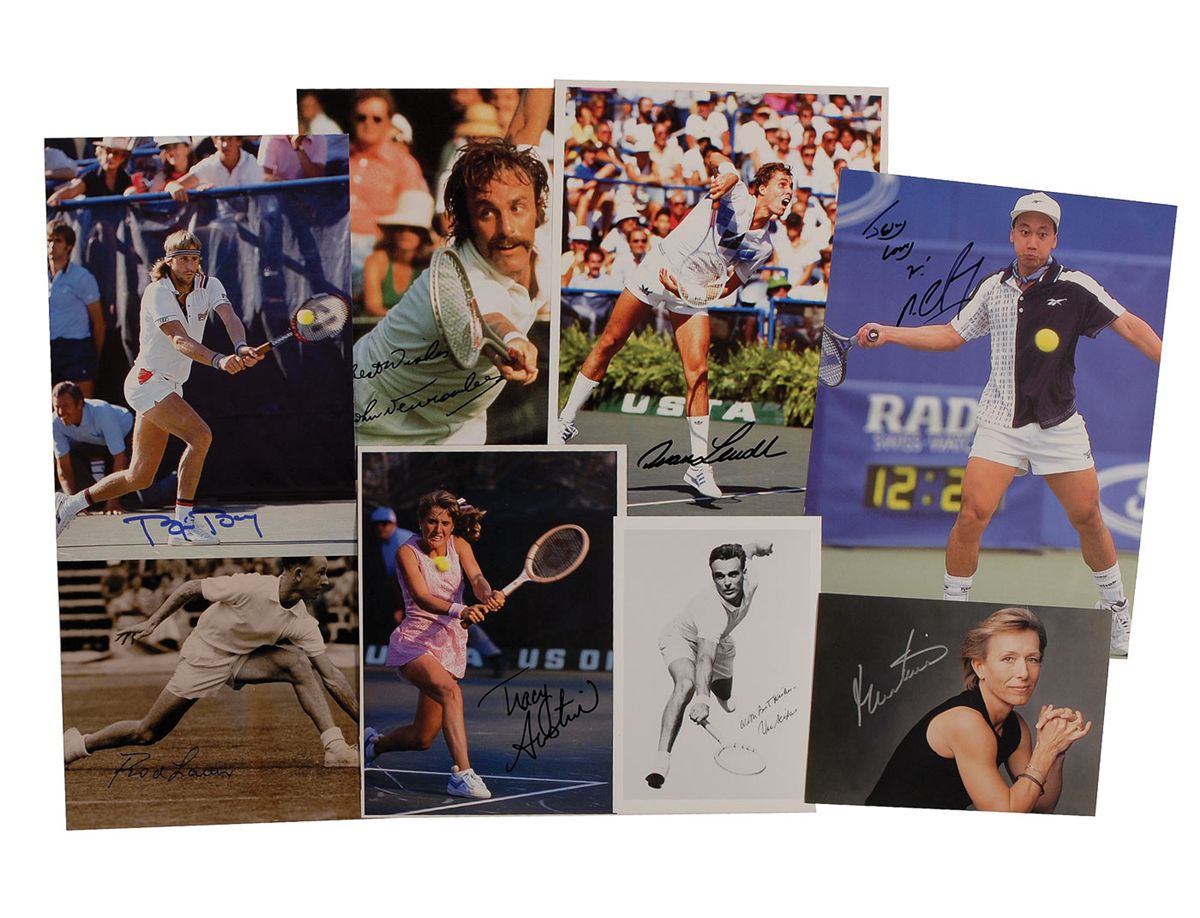 Eight photos, varying in color and finish, ranging in size from 5 x 7 to 5.5 x 10.75, each signed in ink by the respective tennis star pictured. Signers are: Vic Seixas, Martina Navratilova, Rod Laver, John Newcombe, Tracy Austin, Ivan Lendl, Bjorn Borg, and Michael Chang. In fine condition.
