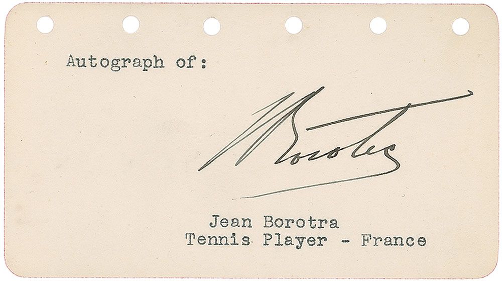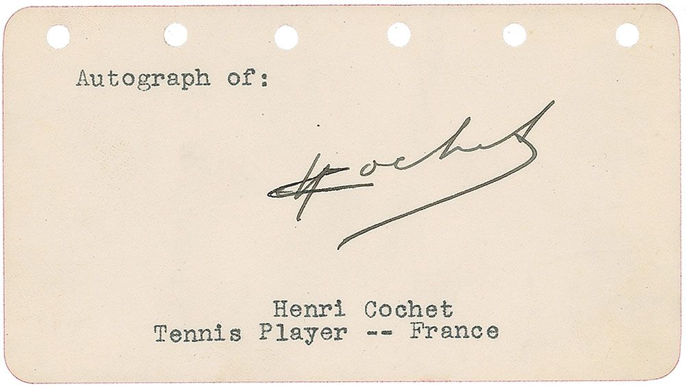 Vintage fountain pen signatures of Henri Cochet and Jean Borotra on individual off-white 4.5 x 2.5 album pages. In fine condition.