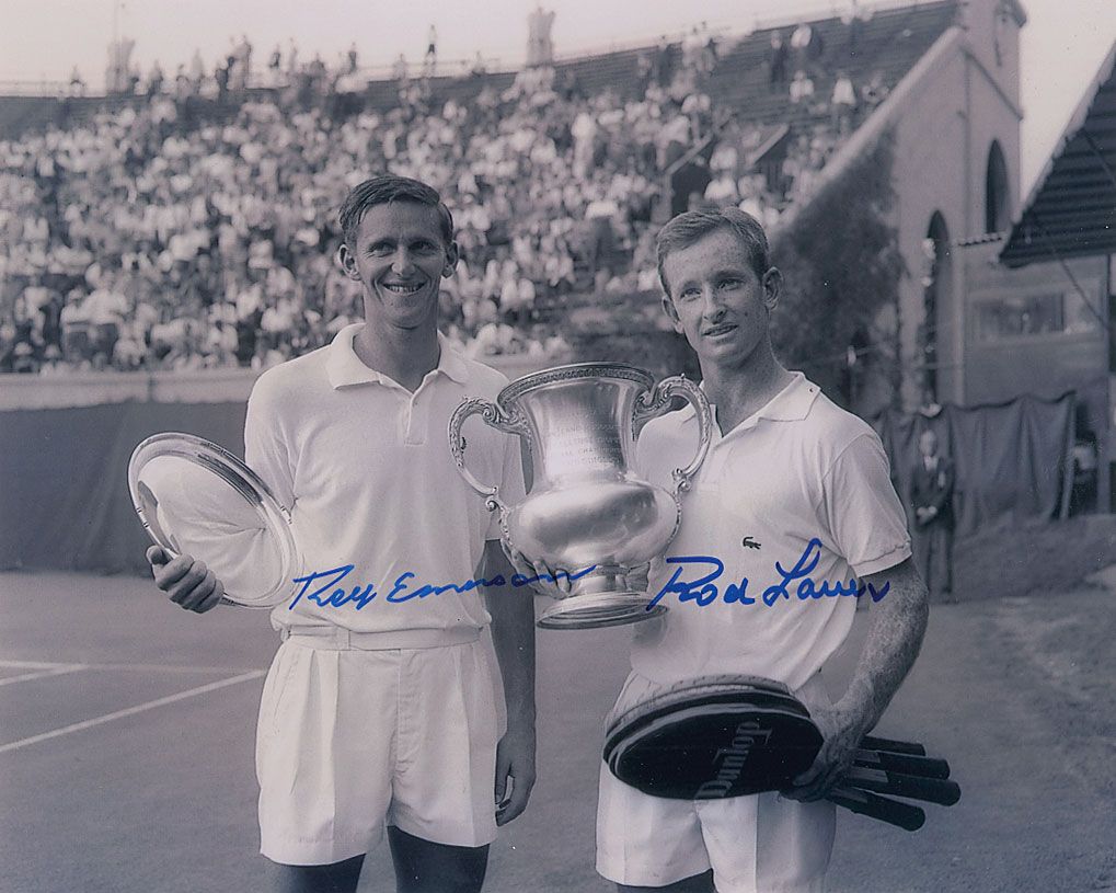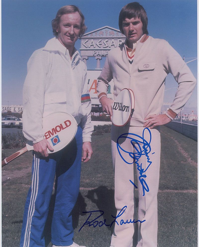 Two photos: color glossy 8 x 10 of Rod Laver and Jimmy Connors posing in front of the Caesar’s Palace marquee, signed in blue felt tip by both; and a glossy 10 x 8 of Laver and Roy Emerson holding their trophies, signed in blue felt tip by both. In fine condition, with a couple of creases to lower right corner of first photo.