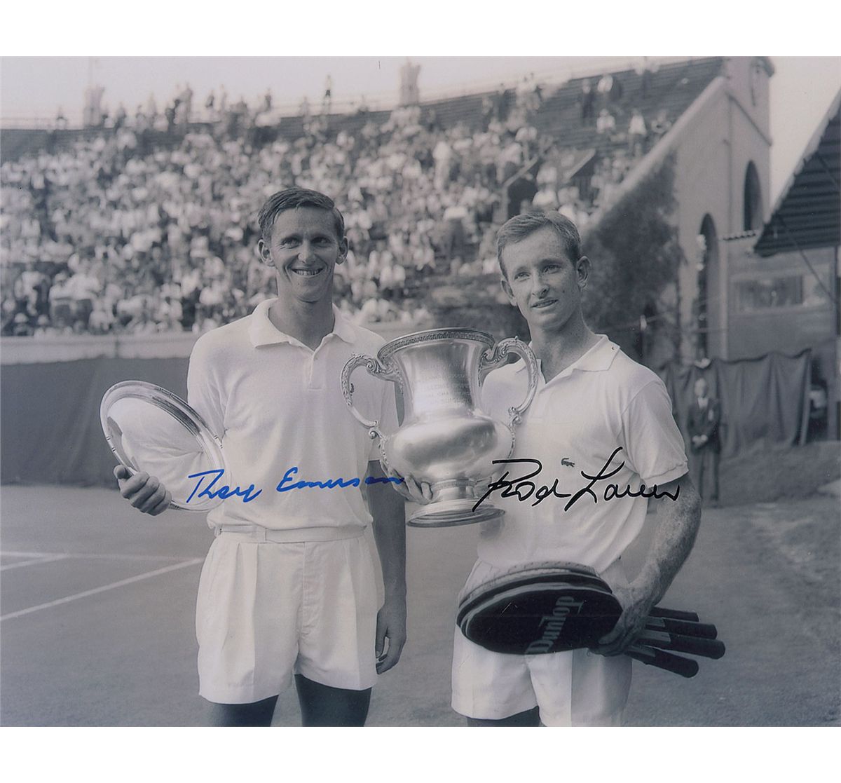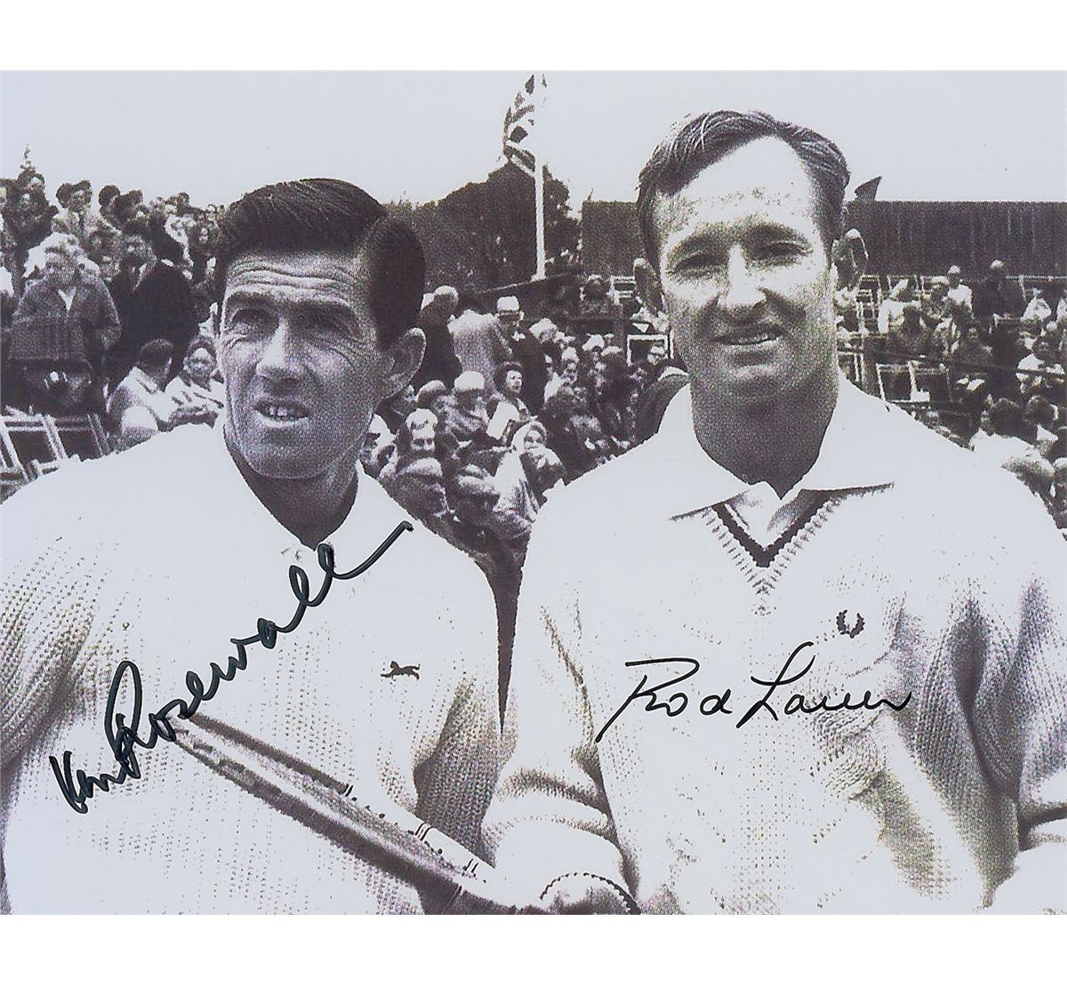 Two glossy 10 x 8 photos: one of Rod Laver and Ken Rosewall, signed in black felt tip by both; and one of Laver and Roy Emerson holding their trophies, signed in felt tip by both. In fine condition, with a vertical bend to left side of Rosewall’s photo passing through a couple letters of signature.