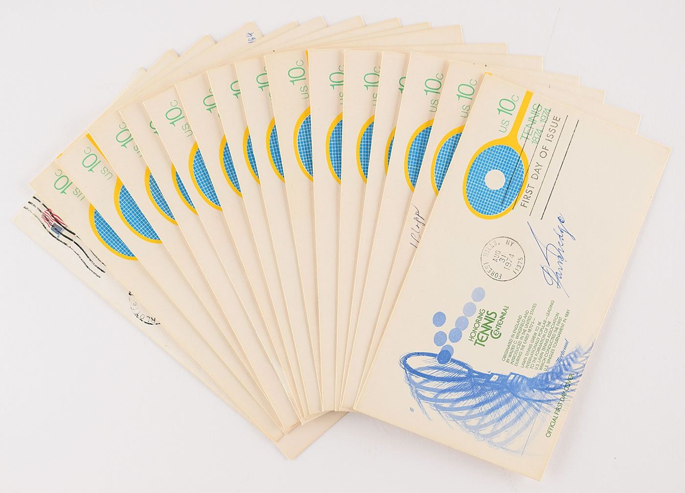 Collection of 17 FDCs with cachets honoring tennis, individually signed in ink by legends of the sport, including: Pauline Betz, Louise Brough, Don Budge, Margaret Osborne duPont, Roy Emerson, Shirley Fry, Althea Gibson, Doris Hart, Helen Hull Jacobs, Jack Kramer, Rod Laver, Alice Marble, Don McNeill, Gardnar Mulloy, Vic Seixas, Bill Talbert, and Helen Wills. In overall fine condition.
