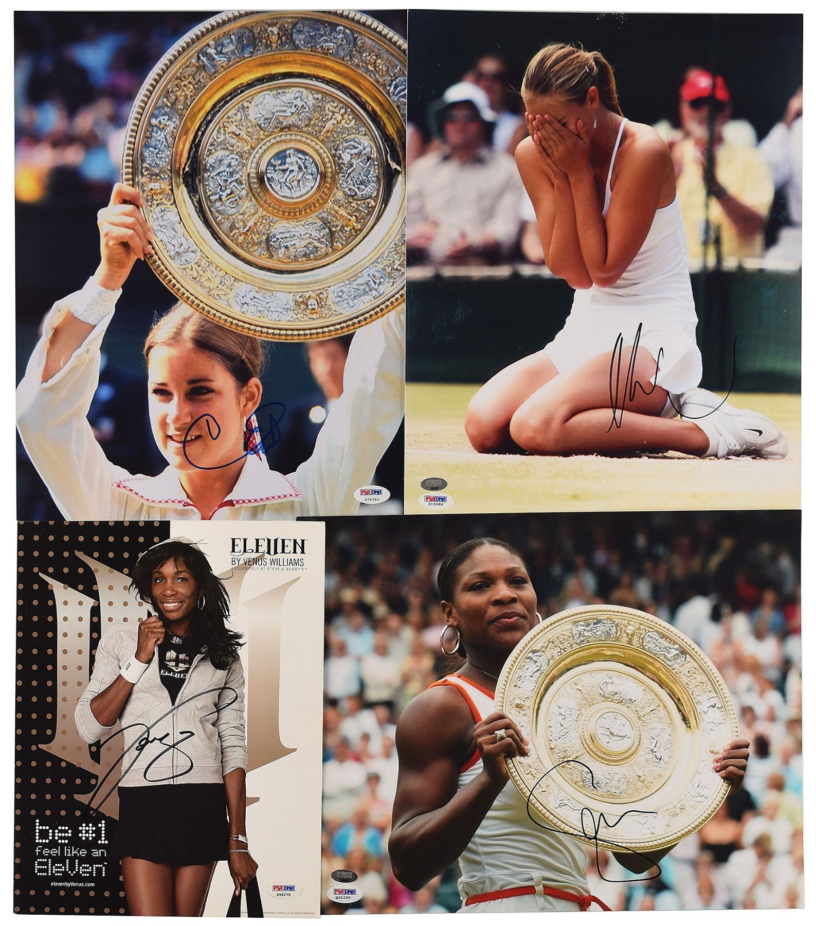 Group lot of four color photos, ranging in size from 8.5 x 11 to 14 x 11, each signed in felt tip by the pictured women’s tennis champion: Chris Evert, Maria Sharapova, Serena Williams, and Venus Williams. In overall fine condition, with PSA/DNA labels affixed to a lower corner of each photo. Accompanied by certificates of authenticity from PSA/DNA for the Venus and Sharapova photos.